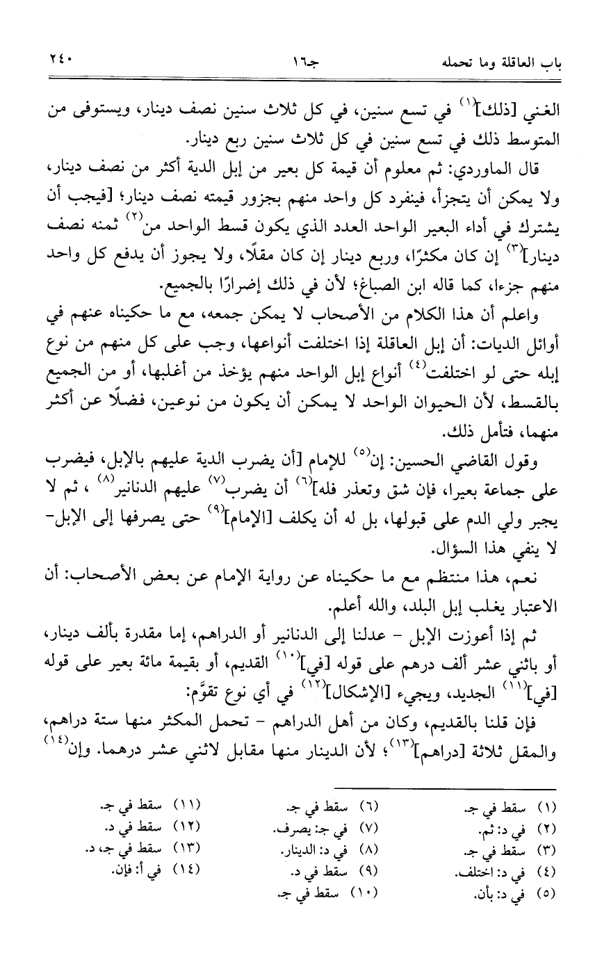 واعلم أن هذا الكلام من الأصحاب لا يمكن جمعه، مع ما حكيناه عنهم في أوائل الديات: أن إبل العاقلة إذا اختلفت أنواعها، وجب على كل منهم من نوع إبله حتى لو اختلفت أنواع إبل الواحد منهم يؤخذ من أغلبها، أو من الجميع بالقسط، لأن الحيوان الواحد لا يمكن أن يكون من نوعين، فضلاً عن أكثر منهما، فتأمل ذلك.