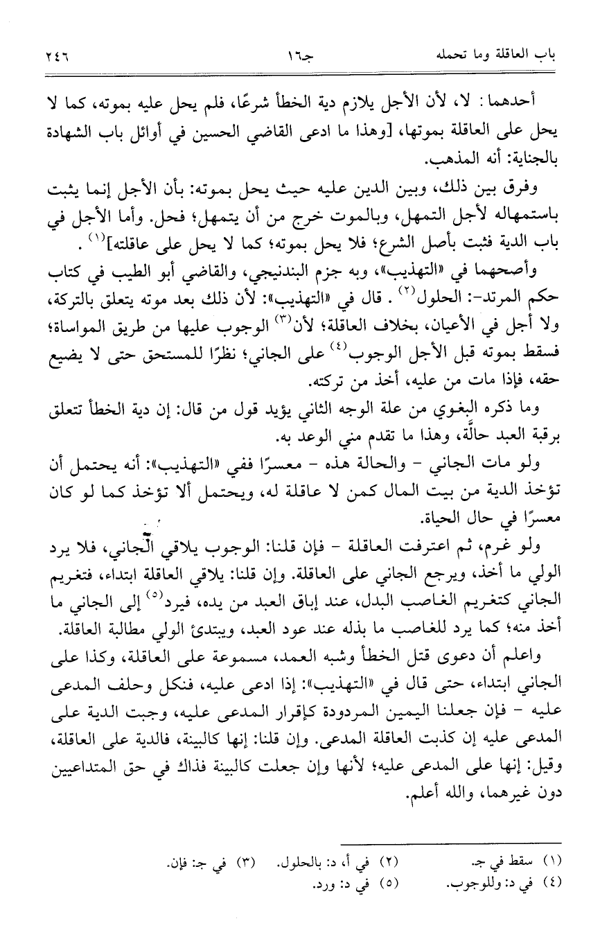 وفرق بين ذلك، وبين الدين عليه حيث يحل بموته: بأن الأجل إنما يثبت باستمهاله لأجل التمهل، وبالموت خرج من أن يتمهل؛ فحل. وأما الأجل في باب الدية فثبت بأصل الشرع؛ فلا يحل بموته؛ كما لا يحل على عاقلته].