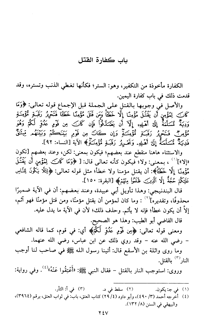 وروى: استوجب النار بالقتل - فقال النبي صلى الله عليه وسلم: "أَعْتِقُوا عَنْهُ". وفي رواية: