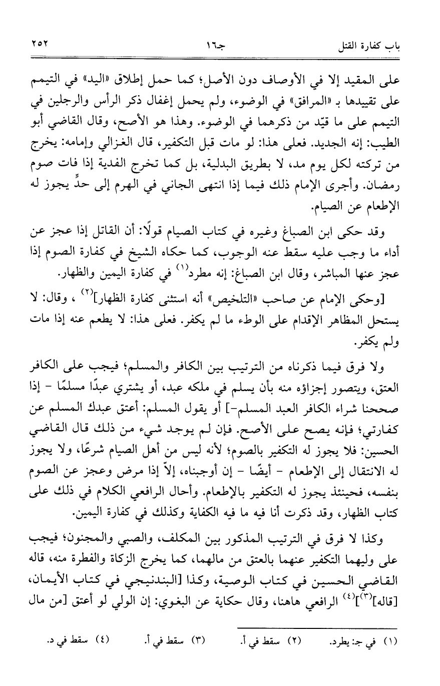 ولا فرق فيما ذكرناه من الترتيب بين الكافر والمسلم؛ فيجب على الكافر العتق، ويتصور إجزاؤه منه بأن سلم في ملكه عبد، أو يشتري عبداً مسلماً – إذا صححنا شراء الكافر العبد المسلم -] أو يقول المسلم: أعتق عبدك المسلم عن كفارتي؛ فإنه يصح على الأصح. فإن لم يوجد شيء من ذلك قال القاضي الحسين: فلا يجوز له التكفير بالصوم؛ لأنه ليس من أهل الصيام شرعاً، ولا يجوز له الانتقال إلى الإطعام –أيضاً – إن أوجبناه، إلاّ إذا مرض وعجز عن الصوم بنفسه، فحينئذ يجوز له التكفير بالإطعام. وأحال الرافعي الكلام في ذلك على كتاب الظهار، وقد ذكرت أنا فيه ما فيه الكفاية وكذلك في كفارة اليمين.