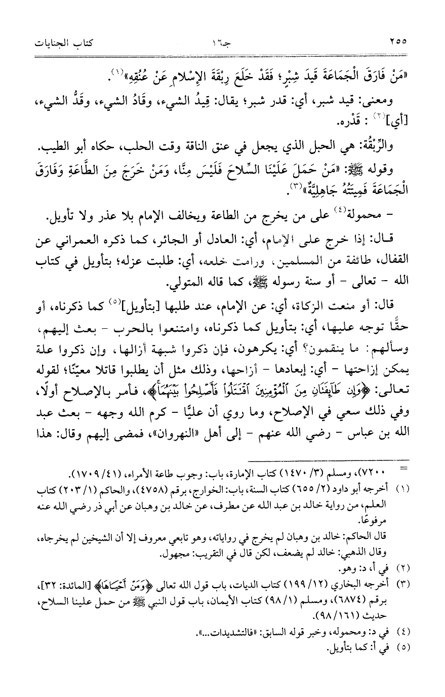 "مَنْ فَارَقَ الْجَمَاعَةَ قَيدَ شِبْرٍ؛ فَقَدْ خَلَعَ رِبْقَةَ الإِسْلامِ عَنْ عُنُقِهِ".