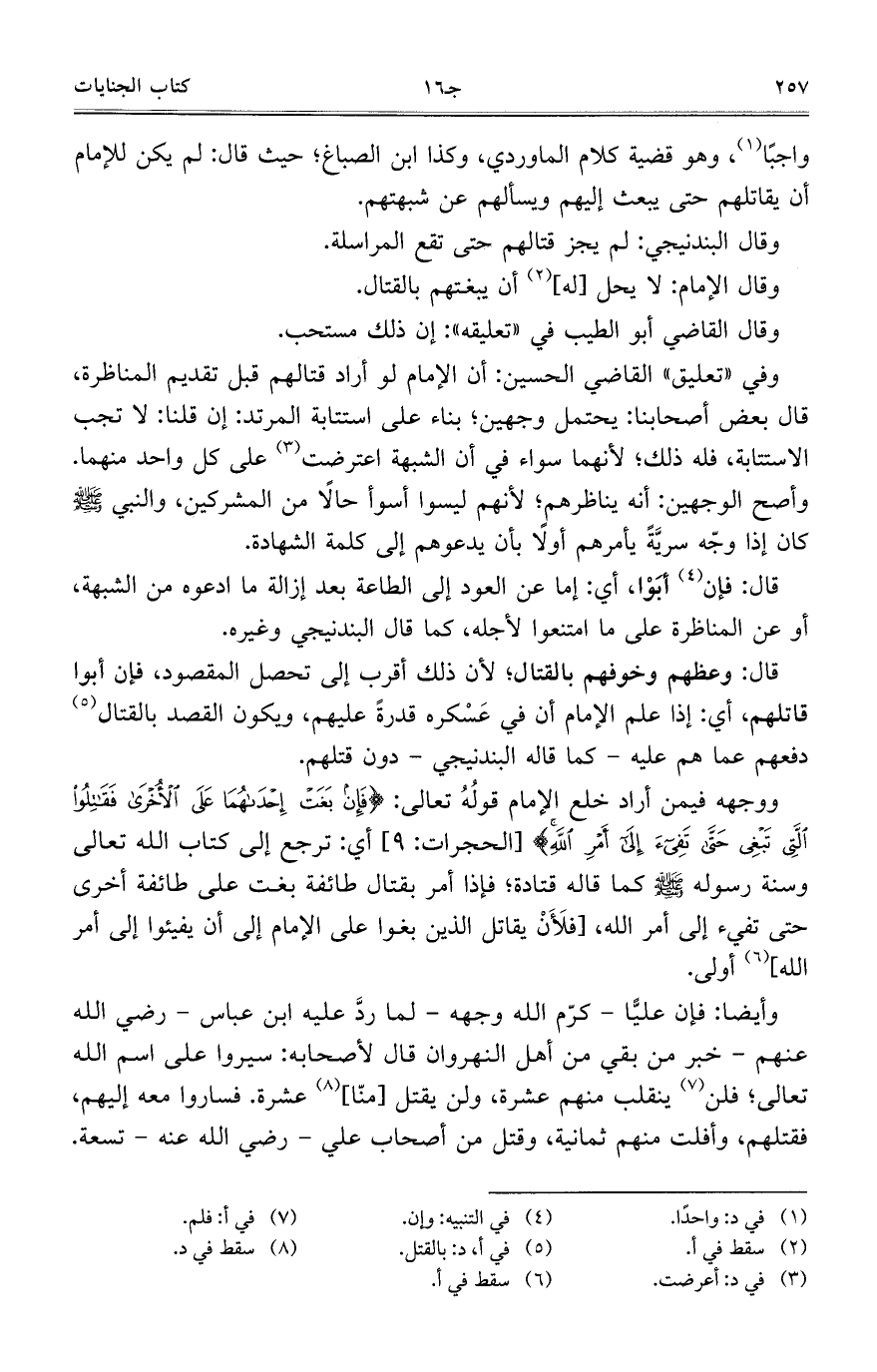 وفي "تعليق" القاضي الحسين: أن افمام لو أراد قتالهم قبل تقديم المناظرة، قال بعض أصحابنا: يحتمل وجهين؛ بناء على استتابة المرتد: إن قلنا: لا تجب الاستتابة، فله ذلك؛ لأنهما سواء في أن الشبهة اعترضت على كل واحد منهما. وأصح الوجهين: أنه يناظرهم؛ لأنهم ليسوا أسوأ حالاً من المشركين، والنبي صلى الله عليه وسلم كان إذا وجه سريَّةً يأمرهم أولاً بأن يدعوهم إلى كلمة الشهادة.