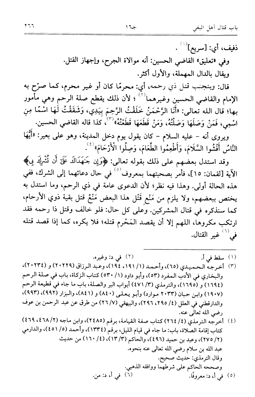 وقد استدل بعضهم على ذلك بقوله تعالى: {وَإِنْ جَاهَدَاكَ عَلى أَنْ تُشْرِكَ بِي} الآية [لقمان: 15]، فأمر بصحبتهما بمعروف في حال دعائهما إلى الشرك، ففي هذه الحالة أولى. وهذا فيه نظر؛ لأن الدعوى عامة في ذي الرحم، وما استدل به يختص ببعضهم، ولا يلزم من مَنْعِ قَتْل هذا البعض مَنْعُ قتل بقية ذوي الأرحام، كما سنذكره في قتال المشركين. وعلى كل حال: فلو خالف وقتل ذا رحمه فقد ارتكب مكروهاً، اللهم إلا أن يقصد المَحْرم قتله؛ فلا يكره، كما إذا قصد قتله في غير القتال.