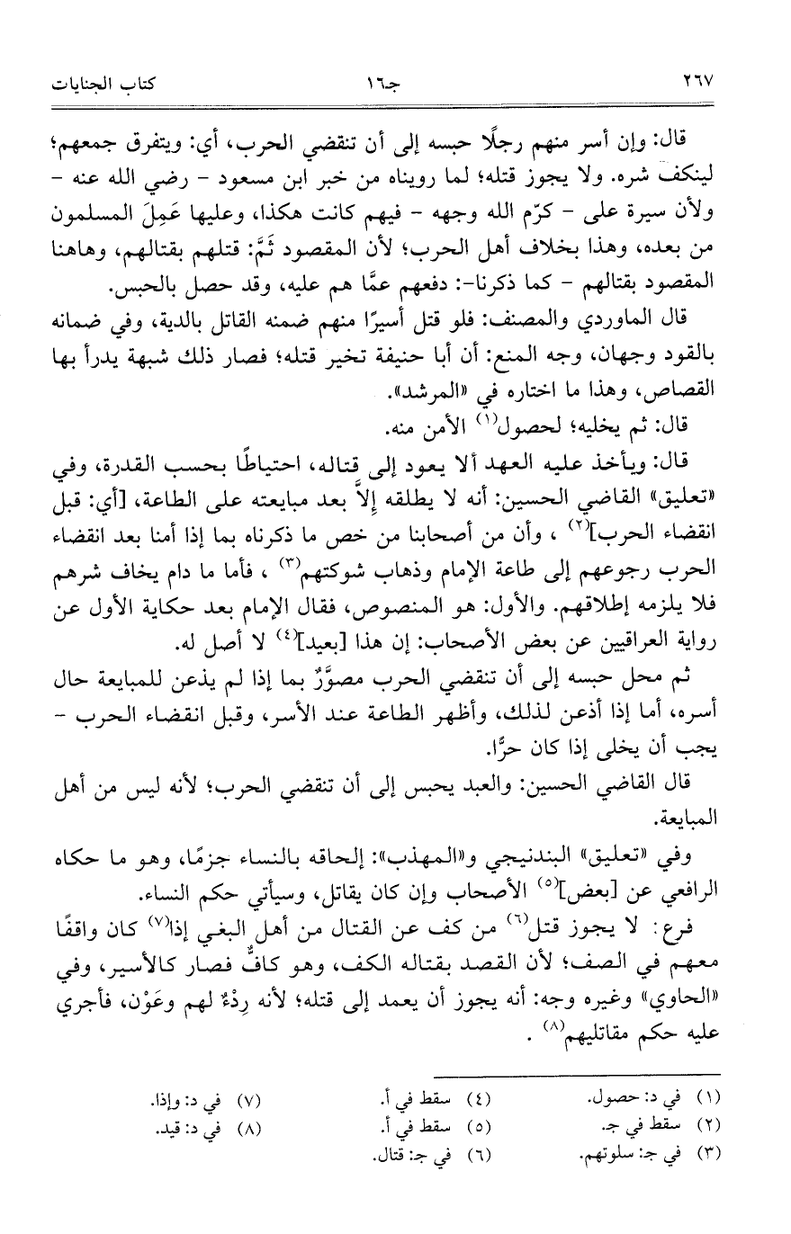 قال: وإن أسر منهم رجلاً حبسه على أن تنقضي الحرب، أي: ويتفرق جمعهم؛ لينكف شره. ولا يجوز قتله؛ لما رويناه من خبر ابن مسعود – رضي الله عنه – ولأن سيرة علي – كرّم الله وجهه – فيهم كانت هكذا، وعليها عَمِلَ المسلمون من بعده، وهذا بخلاف أهل الحرب؛ لأن المقصود ثَمَّ: قتلهم بقتالهم، وهاهنا المقصود بقتالهم –كما ذكرنا -: دفعهم عمَّا هم عليه، وقد حصل بالحبس.