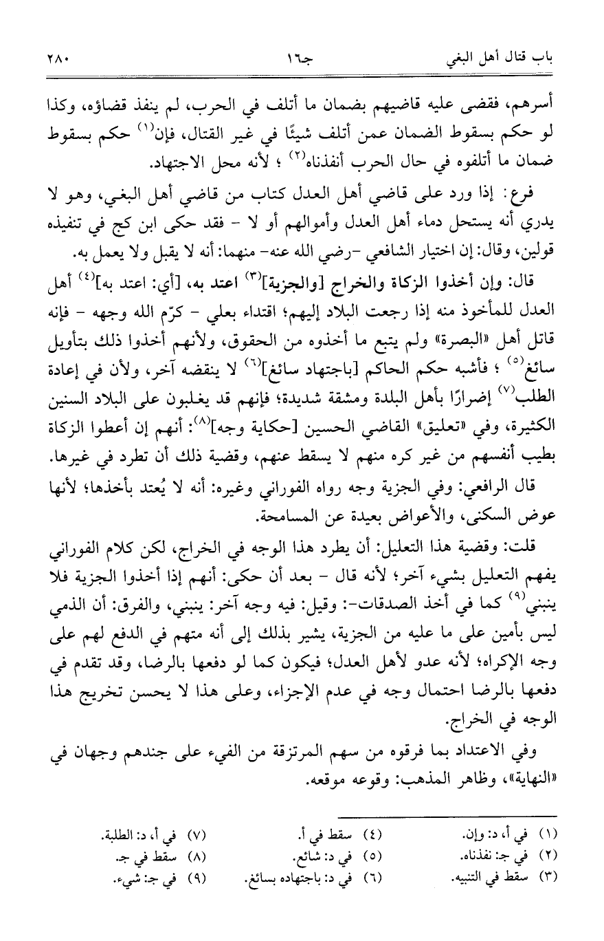 قال: وإن أخذوا الزكاة والخراج [والجزية] اعتد به، [أي: اعتد به] أهل العدل للمأخوذ منه إذا رجعت البلاد إليهم؛ اقتداء بعلي – كرّم الله وجهه – فإنه قاتل أهل "البصرة" ولم يتبع ما أخذوه من الحقوق، ولأنهم أخذوا ذلك بتأويل سائغ؛ فأشبه حكم الحاكم [باجتهاد سائغ] لا ينقضه آخر، ولأن في إعادة الطلب إضراراً بأهل البلدة ومشقة شديدة؛ فغنهم قد يغلبون على البلاد السنين الكثيرة، وفي "تعليق" القاضي الحسين [حكاية وجه]: أنهم إن أعطوا الزكاة بطيب أنفسهم من غير كره منهم لا يسقط عنهم، وقضية ذلك أن تطرد في غيرها.
