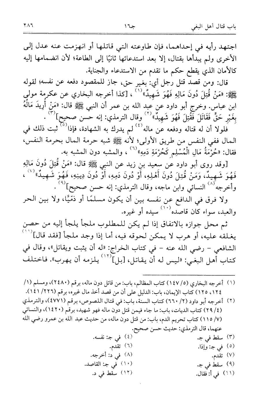 [وقد روى أبو داود عن سعيد بن زيد عن النبي صلى الله عليه وسلم قال: "مَنْ قُتِلَ دُونَ مَالِهِ فَهُوَ شَهِيدٌ، وَمَنْ قُتِلَ دُونَ أَهْلِهِ، أَوْ دُونَ دَمِهِ، اَوْ دُونَ دِينِهِ، فَهُوَ شَهِيدٌ"، وأخرجه النسائي وابن ماجهن وقال الترمذي: إنه حسن صحيح].