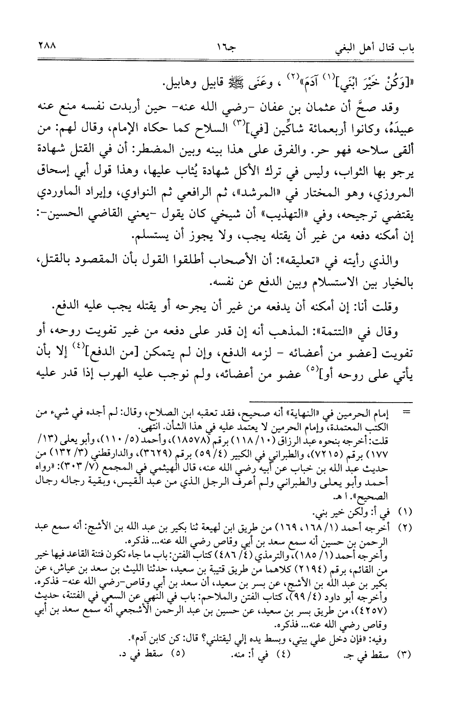 وقد صحَّ أن عثمان بن عفان – رضي الله عنه – حين أربدت نفسه منع عنه عبيدَهُ، وكانوا أربعمائة شاكِّين [في] السلاح كما حكاه الإمام، وقال لهم: من ألقى سلاحه فهو حر. والفرق على هذا بنيه وبين المضطر: أن في القتل شهادة يرجو بها الثواب، وليس في ترك الأكل شهادة يُثاب عليها، وهذا قول أبي إسحاق المروزي، وهوا لمختار في "المرشد"، ثم الرافعي ثم النواوي، وإيراد الماوردي يقتضي ترجيحه، وفي "التهذيب" أن شيخي كان يقول – يعني القاضي الحسين -: إن أمكنه دفعه من غير أن يقتله يجب، ولا يجوز أن يستسلم.
