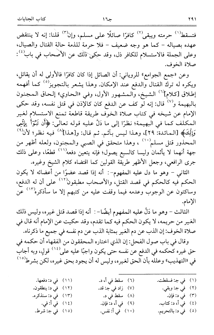 وعن "جمع الجوامع" للروياني: أن الصائل إذا كان كافراً فالأولى له أن يقاتل، ويكره له ترك القتال والدفع عند الإمكان. وهذا يشعر بالتجويز كما أفهمه إطلاق [كلامي الشيخ، والمشهور الأول، وفي "الحاوي" إلحاق المجنون بالبهيمة وقال: إنه لو كف عن الدفع كان كالإذن في قتل نفسه، وقد حكى الإمام عن شيخه في كتاب صلاة الخوف طريقة قاطعة تمنع الاستسلام لغير المكلف كما في البهيمة؛ نظراً إلى ما دَلَّ عليه قوله تعالى: {أَنْ تَبُوءَ بِإِثْمِي وَإِثْمِكَ} [المائدة: 29]، وهذا ليس بآثم. ثم قال: و [هذا] فيه نظر؛ لأن المحذور قتل مسلم، وهذا متحقق في الصبي والمجنون، ولعله أظهر من جهة أنهما لا يأثمان وليسا كالسبع يصول؛ فإنه يتعين دفعه قطعاً، وعلى ذلك جرى الرافعي، وجعل الأظهر طريقة القولين كما اقتضاه كلام الشيخ وغيره.