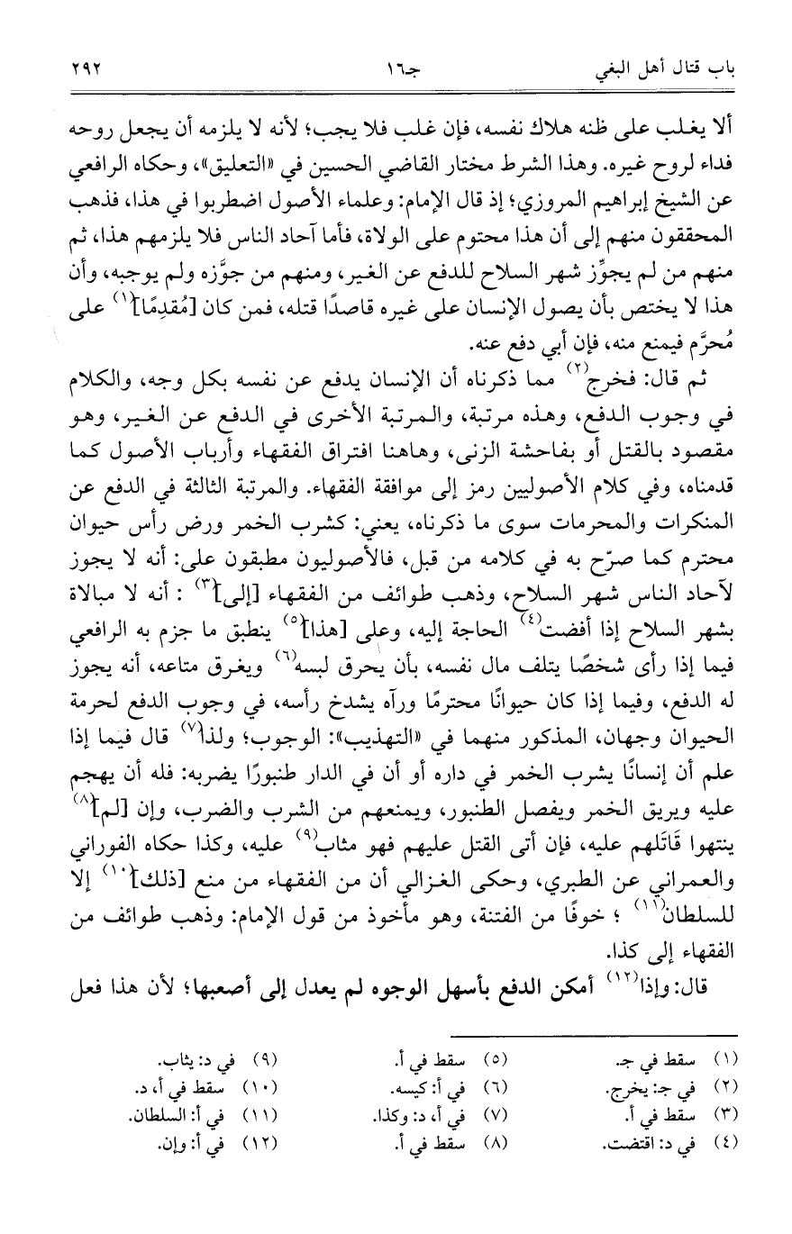 ثم قال: فخرج مما ذكرناه أن الإنسان يدفع عن نفسه بكل وجه، والكلام في وجوب الدفع، وهذه مرتبة، والمرتبة الأخرى في الدفع عن الغير، وهو مقصود بالقتل أو بفاحشة الزنى، وهاهنا افتراق الفقهاء وأرباب الأصول كما قدمناه، وفي كلام الأصوليين رمز إلى موافقة الفقهاء. والمرتبة الثالثة في الدفع عن المنكرات والمحرمات سوى ما ذكرناه، يعني: كشرب الخمر ورض رأس حيوان محترم كما صرّح به في كلامه من قبل، فالأصوليون مطبقون على: أنه لا يجوز لآحاد الناس شهر السالح، وذهب طوائف من الفقهاء [إلى]: أنه لا مبالاة بشهر السلاح إذا أفضت الحاجة إليه، وعلى [هذا] ينطبق ما جزم به الرافعي فيما إذا رأى شخصاً يتلف مال نفسه، بأن يحرق لبسه ويغرق متاعه، أنه يجوز له الدفع، وفيما إذا كان حيواناً محترماً ورآه يشدخ لبسه ويغرق متاعه، أنه يجوز له الدفع، وفيما إذا كان حيواناً محترماً ورآه يشدخ رأسه، في وجوب الدفع لحرمة الحيوان وجهان، المذكور منهما في "التهذيب": الوجوب؛ ولذا قال فيما إذا علم أن إنساناً يشرب الخمر في داره أو أن في الدار طنبوراً يضربه: فله أن يهجم عليه ويريق الخمر ويفصل الطنبور، ويمنعهم من الشرب والضرب، وإن [لم] ينتهوا قَاتَلهم عليه، فإن أتى القتل عليهم فهو مثاب عليه، وكذا حكاه الفوراني والعمراني عن الطبري، وحكى الغزالي من أن من الفقهاء من منع [ذلك] إلا للسلطان؛ خوفاً من الفتنة، وهو مأخوذ من قول الإمام: وذهب طوائف من الفقهاء إلى كذا.