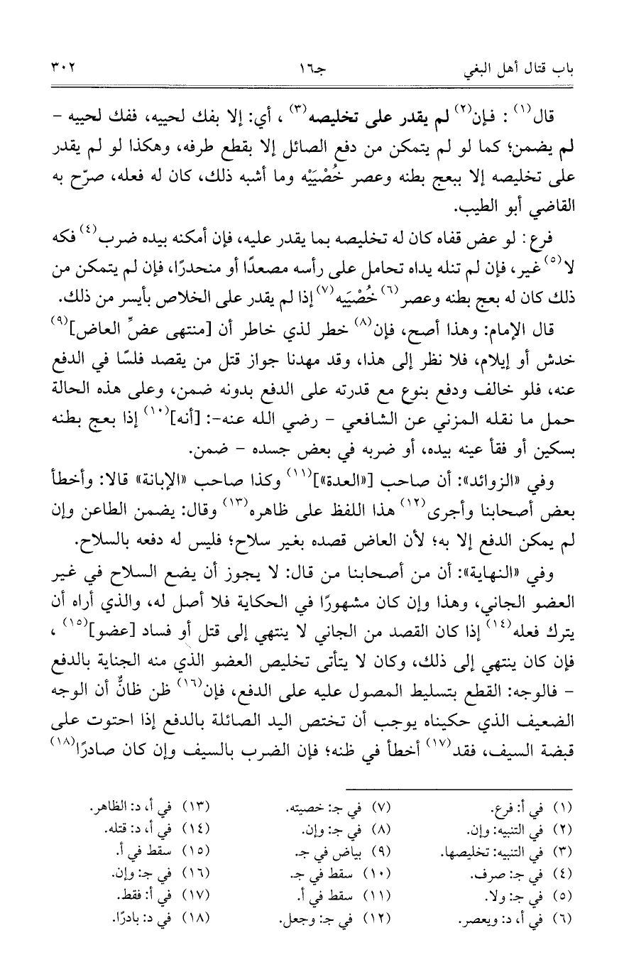 وفي "النهاية": أن من أصحابنا من قال: لا يجوز أن يضع السلاح في غير العضو الجاني، وهذا وإن كان مشهوراً في الحكاية فلا أصل له، والذي أراه أن يترك فعله إذا كان القصد من الجاني لا ينتهي إلى قتل أوف فساد [عضو]، فإن كان ينتهي إلى ذلك، وكان لا يتأتى تخليص العضو الذي منه الجناية بالدفع – فالوجه: القطع بتسليط المصول عليه على الدفع، فإن ظن ظانٌّ أن الوجه الضعيف الذي حكيناه يوجب أن تختص اليد الصائلة بالدفع إذا احتوت على قبضه السيف، فقد أخطأ في ظنه؛ فإن الضرب بالسيف وإن كان صادراً