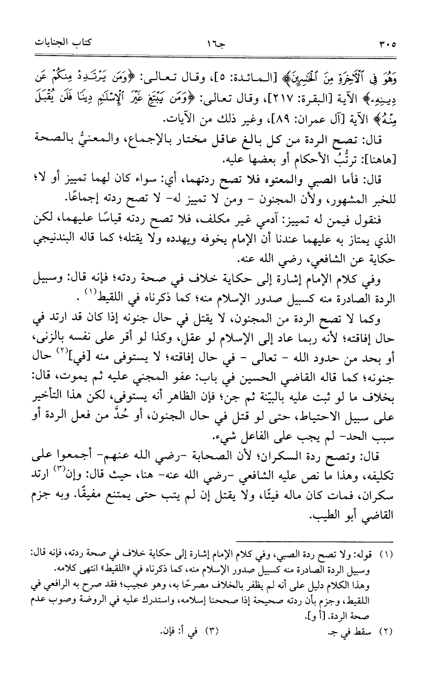 قال: وتصح ردة السكران؛ لأن الصحابة – رضي الله عنهم – أجمعوا على تكليفه، وهذا ما نص عليه الشافعي – رضي الله عنه – هنا، حيث قال: وإن ارتد سكران، فمات كان ماله فيئاً، ولا يقتل إن لم يتب حتى يمتنع مفيقاً. وبه جزم القاضي أبو الطيب.