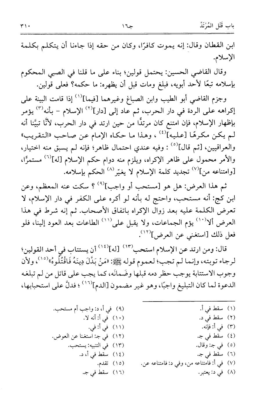 قال: ومن ارتد عن الإسلام استحب [له] أن يستتاب في أحد القولين؛ لرجاء توبته، وإنما لم تجب؛ لعموم قوله صلى الله عليه وسلم: "مَنْ بَدَّلَ دِينَهُ فَاقْتُلُوهُ"، ولأن وجوب الاستتابة يوجب حظر دمه قبلها وضَمانَه، كما يجب على قاتل من لم تبلغه الدعوة لما كان التبليغ واجباً، وهو غير مضمون [الدم]؛ فدلَّ على استحبابها،