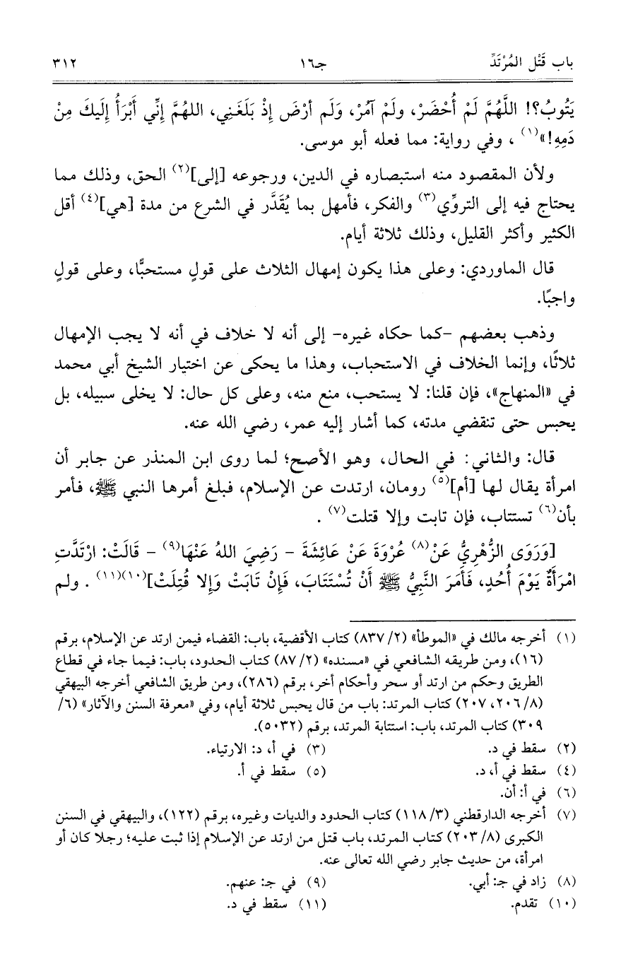 [وَرَوُى الزُّهْرِيُّ عَنْ عُرْوَةَ عَنْ عَائِشَةَ – رَضِيَ اللهُ عَنْهَا – قَالَتْ: ارْتَدَّتِ امْرَأَةٌ يَوْمَ أُحُدِ، فَأَمَرَ النَّبِيُّ صلى الله عليه وسلم أَنْ تُسْتَتَابَ، فَإِنْ تَابَتْ وَإِلا قُتِلَتْ]. ولم