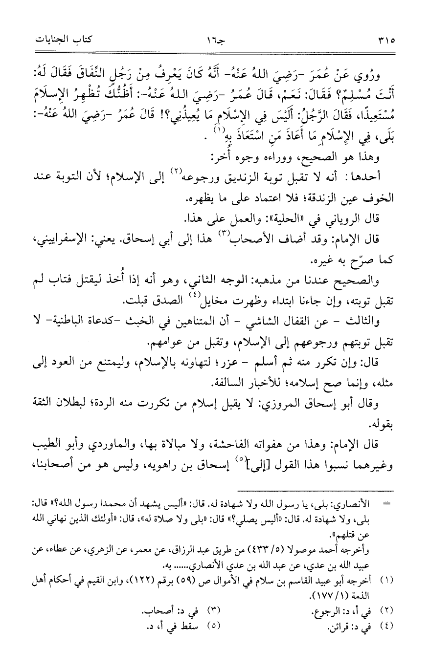 أحدها: أنه لا تقبل توبة الزنديق ورجوعه إلى الإسلام؛ لأن التوبة عند الخوف عين الزندقة؛ فلا اعتماد على ما يظهره.