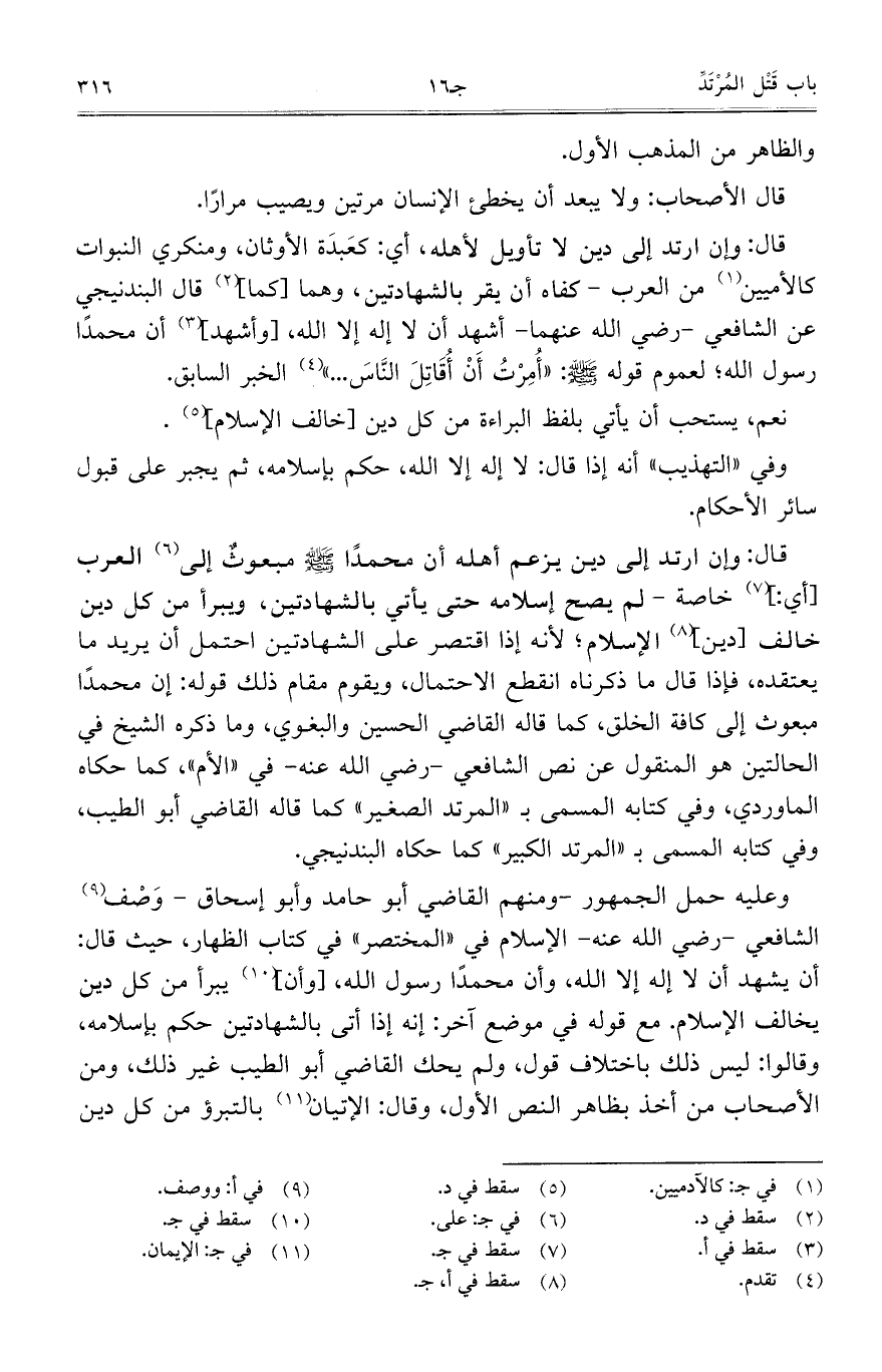 قال: وإن ارتد إلى دين يزعم أهله أن محمداً صلى الله عليه وسلم مبعوثٌ إلى العرب [أي:] خاصة – لم يصح إسلامه حتى يأتي بالشهادتين، ويبرأ من كل دين خالف [دين] الإسلام؛ لأنه إذا اقتصر على الشهادتين احتمل أن يريد ما يعتقده، فإذا قال ما ذكرناه انقطع الاحتمال، ويقوم مقام ذلك قوله: إن محمداً مبعوث إلى كافة الخلق، كما قاله القاضي الحسين والبغوي، وماذكره الشيخ في الحالتين هو المنقول عن نص الشافعي – رضي الله عنه- في "الأم"،كما حكاه الماوردي، وفي كتابه المسمى بـ "المرتد الصغير" كما قاله القاضي أبو الطيب، وفي كتابه المسمى بـ "المرتد الكبير" كما حكاه البندنيجي.