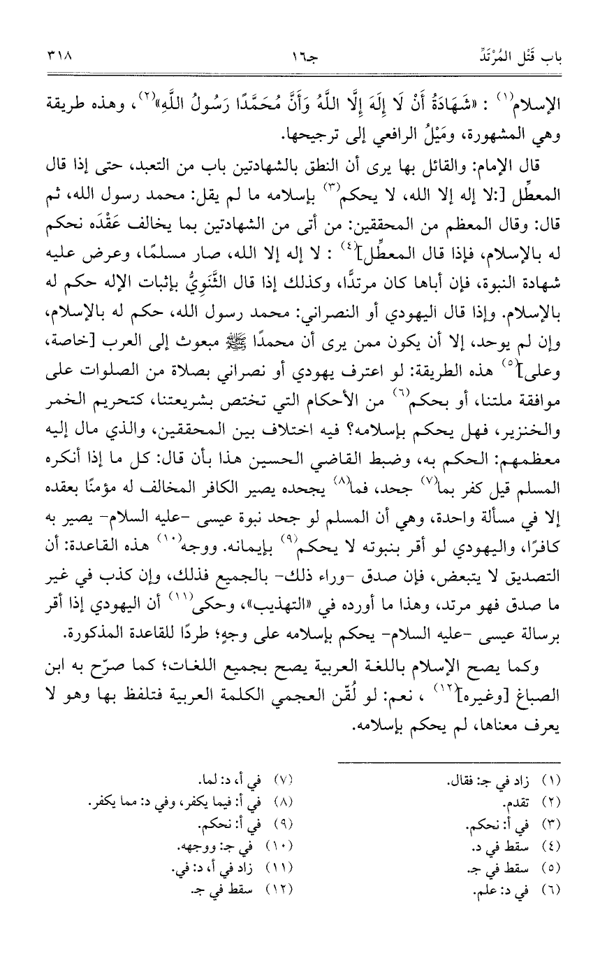 الإسلام: "شَهَادَةُ أَنْ لاَ إِلَهَ إِلاَّ اللهُ وَأَنَّ مُحَمَّداً رَسُولُ اللهِ"، وهذه طريقة وهي المشهورة، ومَيْلُ الرافعي إلى ترجيحها.