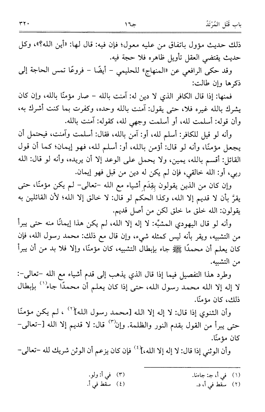وطرد هذا التفصيل فيما إذا قال الذي يذهب إلى قدم أشياء مع الله – تعالى-: لا إله إلا الله محمد رسول الله، حتى إذا كان يعلم أن محمداً جاء بإبطال ذلك، كان مؤمناً.