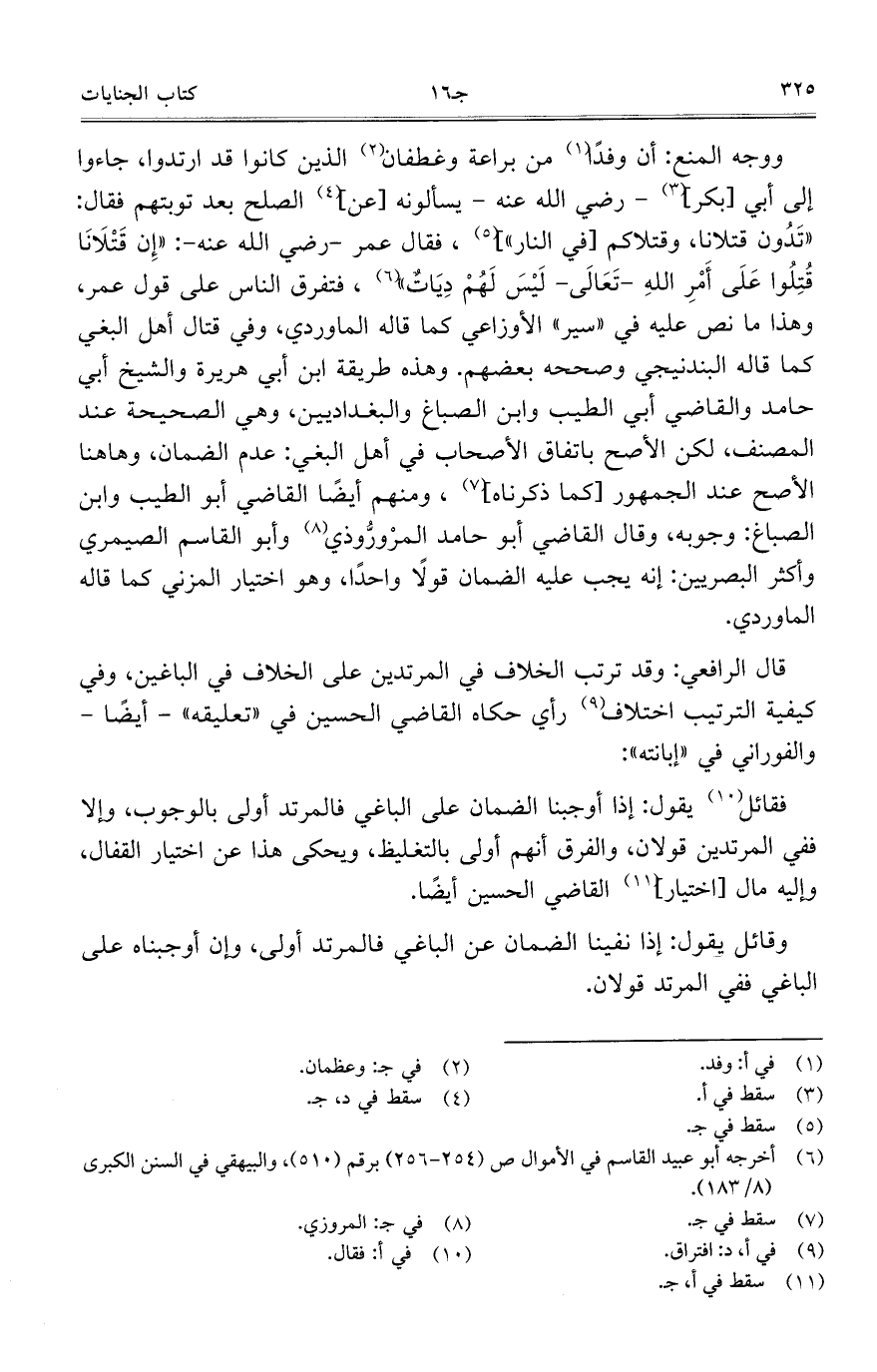 ووجه المنع: أن وفداً من براعة وغطفان الذين كانوا قد ارتدوا، جاءوا إلى أبي [بكر] – رضي الله عنه- يسألونه [عن] الصلح بعد توبتهم فقال: "تَدُون قتلانا، وقتلاكم [في النار"]، فقال عمر – رضي الله عنه-: "إِن قَتْلانَا قُتِلُوا عَلَى أَمْرِ اللهِ – تَعَالَى – لَيْسَ لَهُمْ دِيَاتٌ"، فتفرق الناس على قول عمر، وهذا ما نص عليه في "سير" الأوزاعي كما قاله الماوردي، وفي قتال أهل البغي كما قاله البندنيجي وصححه بعضهم. وهذه طريقة ابن أبي هريرة والشيخ أبي حامد والقاضي أبي الطيب وابن الصباغ والبغداديين، وهي الصحيحة عند المصنف، لكن الأصح باتفاق الأصحاب في أهل البغي: عدم الضمان، وهاهنا الأصح عند الجمهور [كما ذكرناه]، ومنهم أيضاً القاضي أبو الطيب وابن الصباغ: وجوبه، وقال القاضي أبو حامد المرْورُّوذي وأبو القاسم الصيمري وأكثر البصريين: إنه يجب عليه الضمان قولاً واحداً، وهو اختيار المزني كما قاله الماوردي.