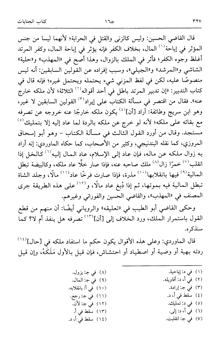 قال القاضي الحسين: وليس كالزنى والقتل في الحرابة؛ لأنهما ليسا من جنس المؤثر في إباحة المال، بخلاف الكفر فإنه يؤثر في إباحة المال، وكفر المرتد أغلظ وجوه الكفر؛ فأثر في الملك بالزوال، وهذا أصح في "المهذب" و"حلية"الشاشي و"المرشد" و"الجيلي"، وسبب إفراده عن القولين السابقين: أنه ليس منصوصاً عليه، لكن في لفظ المزني شيء يحتمله ويحتمل غيره؛ فإنه قال في كتاب التدبير: "إن تدبير المرتد باطل في أحد أقواله الثلاثة؛ لأن ملكه خارج عنه". فقال من اقتصر في مسألة الكتاب على إيراد القولين السابقين لا غير، وهو ابن سريج وطائفة: أراد [أن] يكون ملكه خارجاً عنه خروجه عن تصرفه مع بقائه على ملكه؛ لأنه لو خرج عن ملكه بالردة لما عاد إليه إلا بتمليك مستجد. وقال من أورد القول الثالث في مسألة الكتاب – وهو أبو إسحاق المروزي، كما نقله البندنيجي، وكثير من الأصحاب، كما حكاه الماوردي: إنه أراد به زوال ملكه عن ماله، فإن عاد إلى الإسلامن عاد المال غليه كالخل إذا انقلب خمراً زال ملك صاحبه عنه، فإذا صار خلاًّ عاد ملكه، وكالبيضة تبطل المالية فيها بانقلابها مذرة، فإذا صارت فرخاً عاد مالاً، وجلد الشاة تبطل المالية فيه بموتها، ثمإذا دُبغ عاد مالاً، وعلى هذه الطريقة جرى المصنف في "المهذب"، والقاضي الحسين والفوراني وغيرهم.