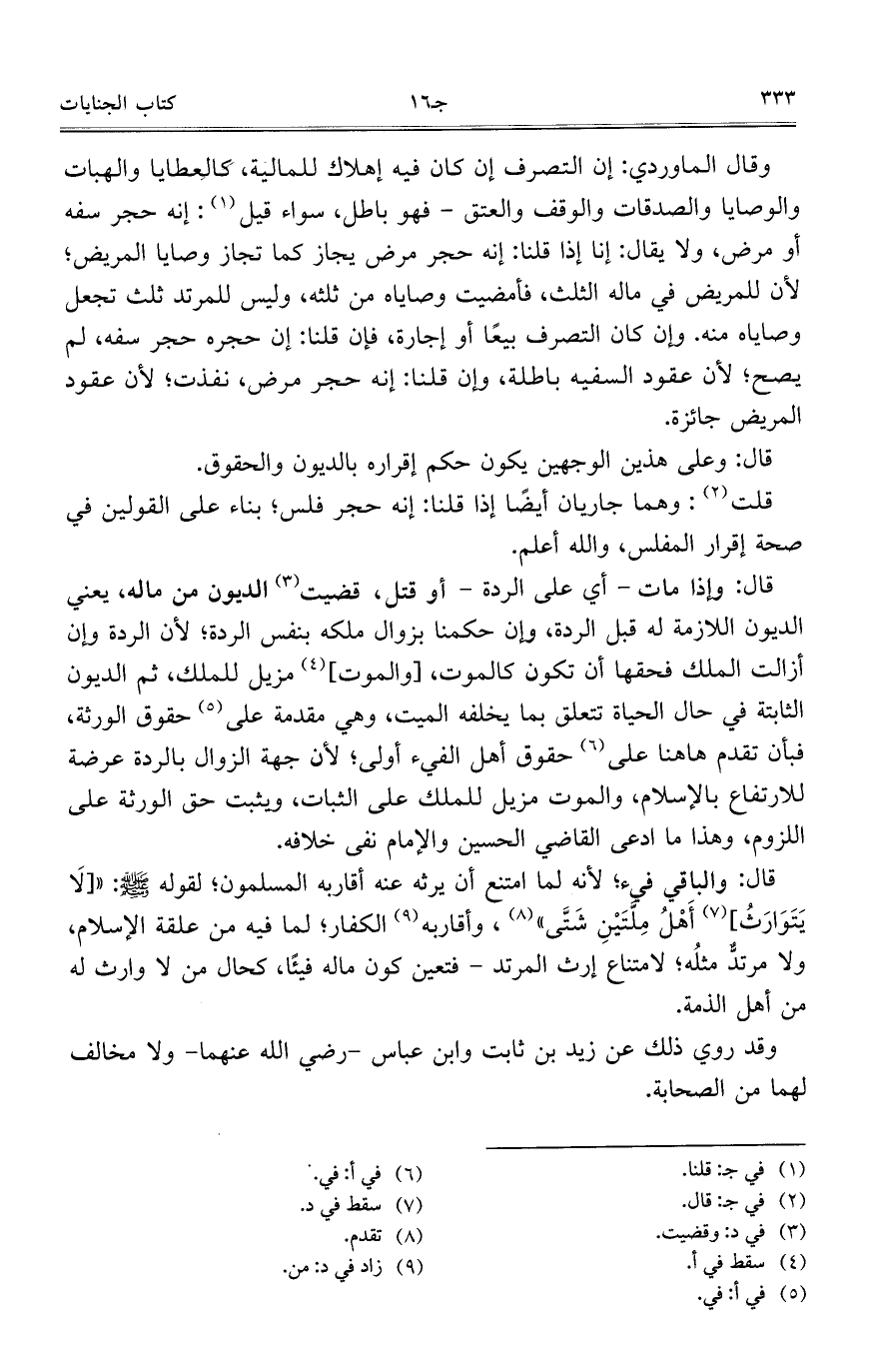 وقال الماوردي: إن التصرف إن كان فيه إهلاك للمالية، كالعطايا والهبات والوصايا والصدقات والوقف والعتق – فهو باطل، سواء قيل: إنه حجر سفه أو مرض، ولا يقال: إنا إذا قلنا: إنه حجر مرض يجاز كما تجاز وصايا المريض؛ لأن للمريض في ماله الثلث، فأمضيت وصاياه من ثلثهن وليس للمرتد ثلث تجعل وصاياه منه. وإن كان التصرف بيعاً أو إجارة، فإن قلنا: إن حجره حجر سفه، لم يصح؛ لأن عقود السفيه باطلة، وإن قلنا: إنه حجر مرض، نفذت؛ لأن عقود المريض جائزة.