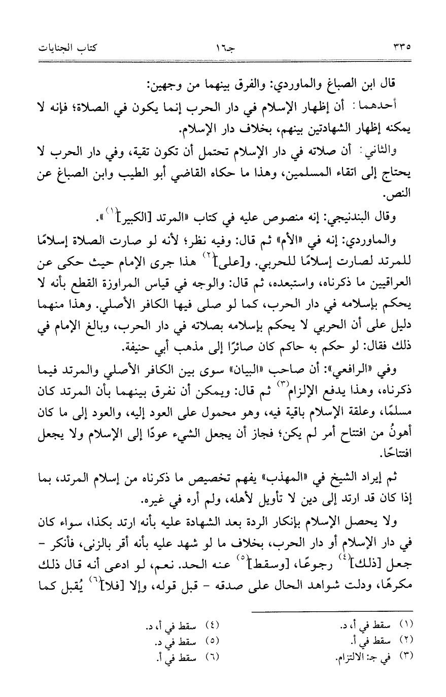 والماوردي: إنه في "الأم" ثم قال: وفيه نظر؛ لأنه لو صارت الصلاة إسلاماً للمرتد لصارت إسلاماً للحربي. و [على] هذا جرى الإمام حيث حكى عن العراقيين ما ذكرناه، واستبعده، ثم قال: والوجه في قياس المراوزة القطع بأنه لا يحكم بإسلامه في دار الحرب، كما لو صلى فيها الكافر الأصلي. وهذا منهما دليل على أن الحربي لا يحكم بإسلامه بصلاته في دار الحرب، وبالغ الإمام في ذلك فقال: لو حكم به حاكم كان صائراً إلى مذهب أبي حنيفة.