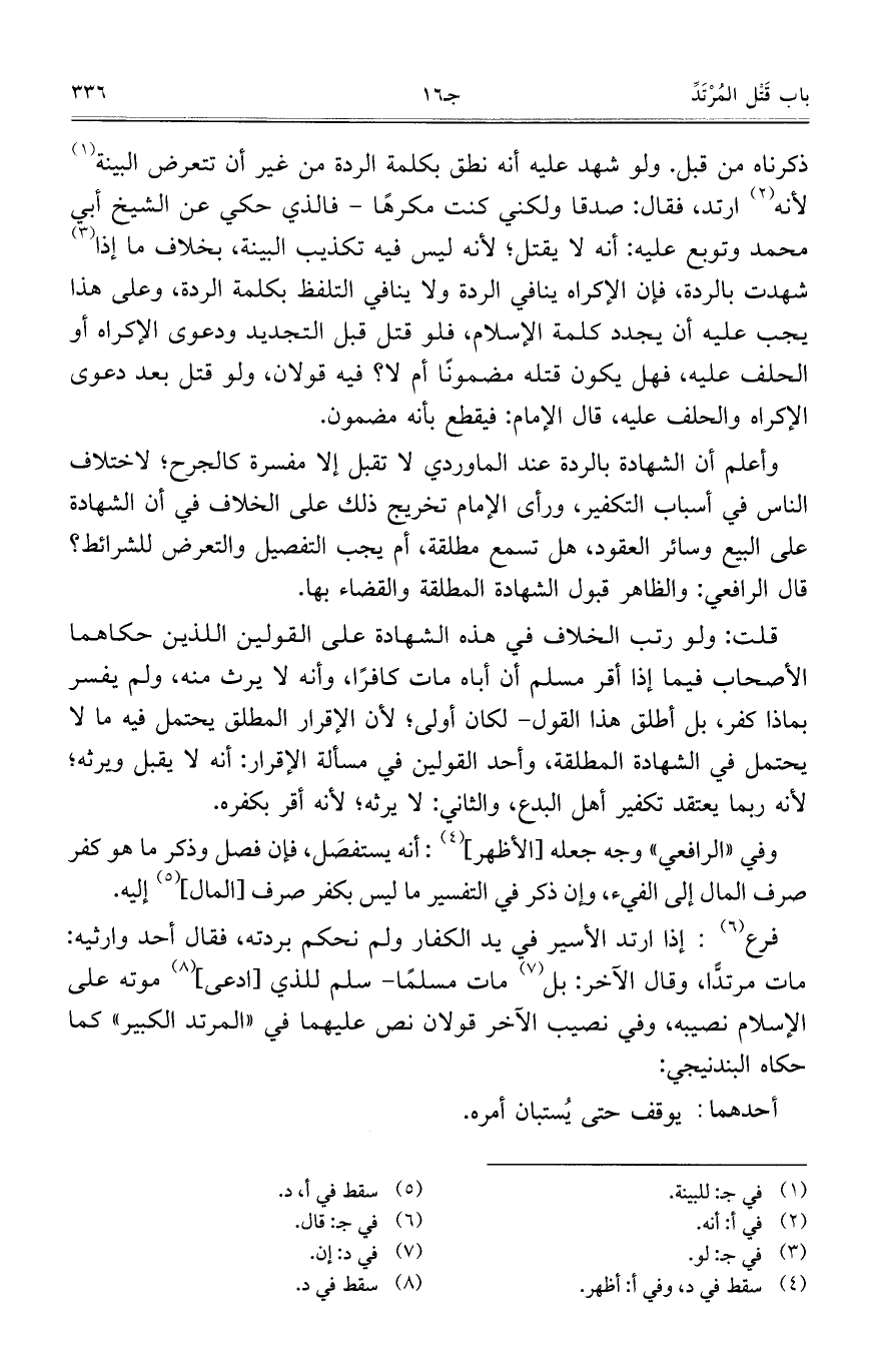 وأعلم أن الشهادة بالردة عند الماوردي لا تقبل إلا مفسرة كالجرح؛ لاختلاف الناس في أسباب التكفير، ورأى الإمام تخريج ذلك على الخلاف في أن الشهادة على البيع وسائر العقود، هل تسمع مطلقة، أم يجب التفصيل والتعرض للشرائط؟ قال الرافعي: والظاهر قبول الشهادة المطلقة والقضاء بها.
