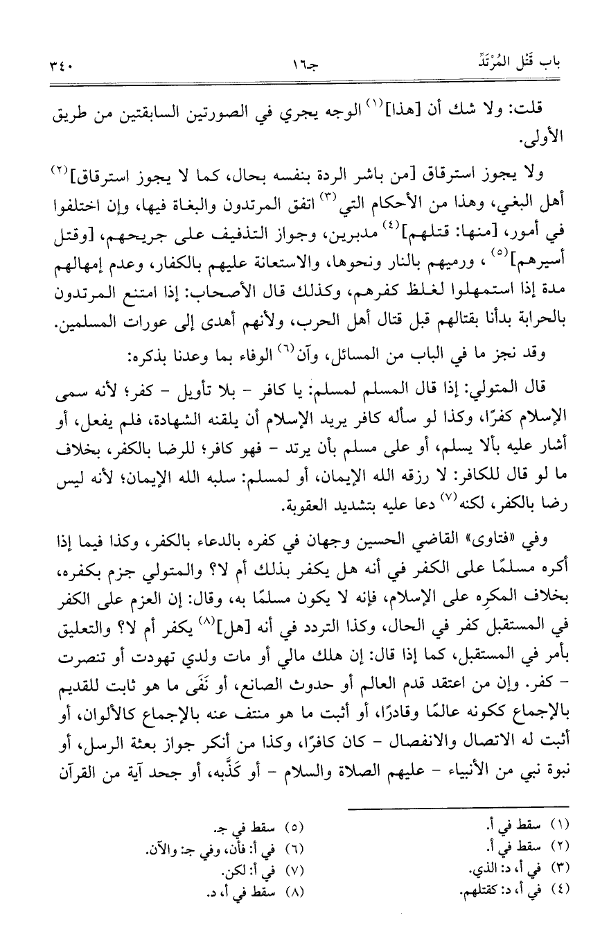 وفي "فتاوى" القاضي الحسين وجهان في كفره بالدعاء بالكفر، وكذا فيما إذا أكره مسلماً على الكفر في أنه هل يكفر بذلك أم لا؟ والمتولي جزم بكفره، بخلاف المكره على الإسلام، إنه لا يكون مسلماً به، وقال: إن العزم على الكفر في المستقبل كفر في الحال، وكذا التردد في أنه [هل] يكفر أم لا؟ والتعليق بأمر في المستقبل، كما إذا قال: إن هلك مالي أو مات ولدي تهودت أو تنصرت –كفر. وإن من اعتقد قدم العالم أو حدوث الصانع، أو نَفَى ما هو ثابت للقديم بالإجماع ككونه عالماً وقادراً، أو أثبت ما هو منتف عنه بالإجماع كالألوان، أو أثبت له الاتصال والانفصال – كان كافراً، وكذا من أنكر جواز بعثة الرسل، أو نبوة نبي من الأنبياء – عليهم الصلاة والسلام – أو كَذَّبه، أو جحد آية من القرآ،