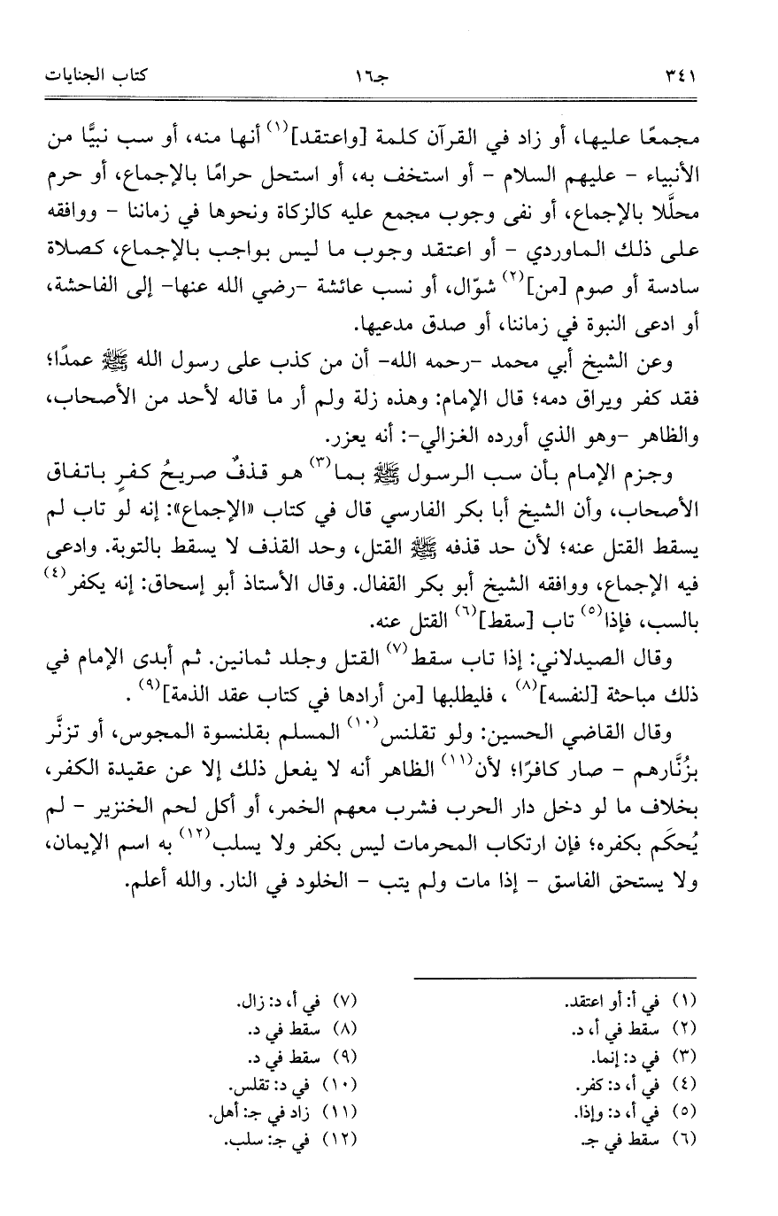 مجمعاً عليها، أو زاد في القرآن كلمة [واعتقد] أنها منه، أو سب نبيًّا من الأنبياء – عليهم السلام – أو استخف به، أو استحل حراماً بالإجماع، أو حرم محلَّلا بالإجماع، أو نفى وجوب مجمع عليه كالزكاة ونحوها في زماننا – ووافقه على ذلك الماوردي – أو اعتقد وجوب ما ليس بواجب بالإجماع، كصلاة سادسة أو صوم [من] شوّال، أو نسب عائشة – رضي الله عنها – إلى الفاحشة، وادعى النبوة في زماننا، أو صدق مدعيها.