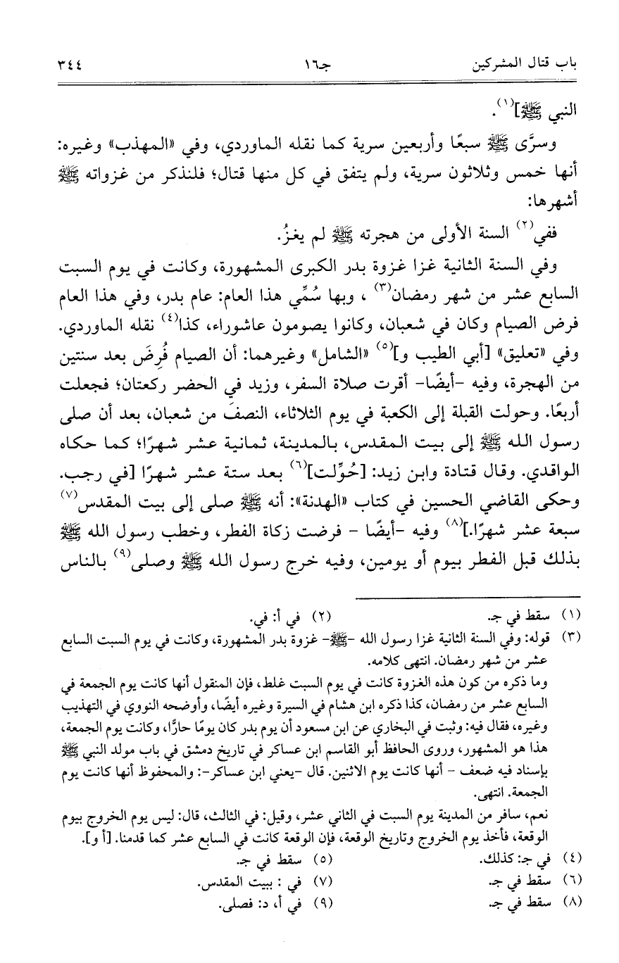 وسرَّى صلى الله عليه وسلم سبعاً وأربعين سرية كما نقله الماوردي، وفي "المهذب" وغيره: أنها خمس وثلاثون سرية، ولم يتفق في كل منها قتال؛ فلنذكر من غزواته صلى الله عليه وسلم أشهرها: