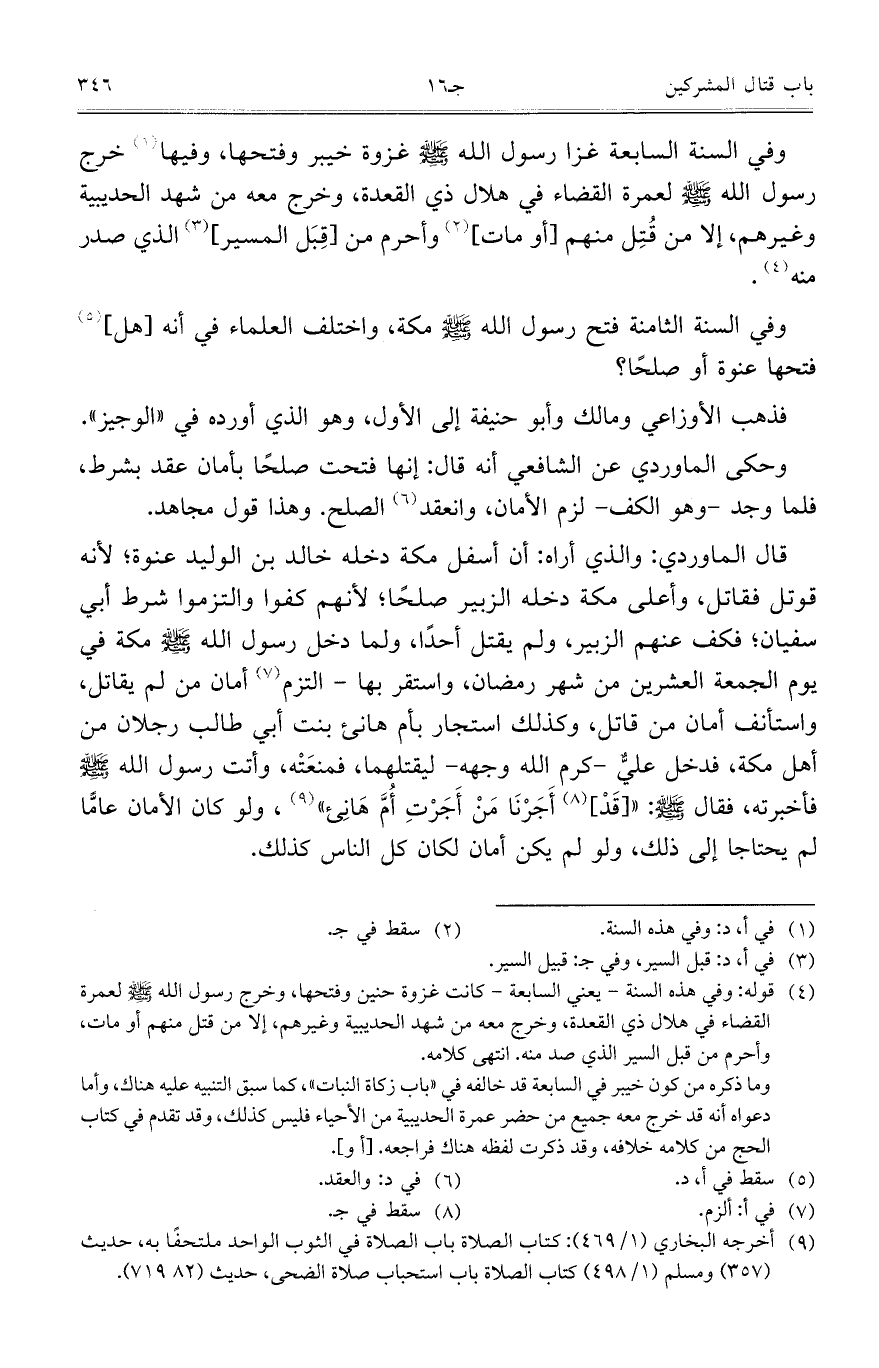 قال الماوردي: والذي أراه: أن أسفل مكة دخله خالد بن الوليد عنوة؛ لأنه قوتل فقاتل، وأعلى مكة دخله الزبير صلحاً؛ لأنهم كفوا والتزموا شرط أبي سفيان؛ فكف عنهم الزبير، ولم يقتل أحداً، ولما دخل رسول الله صلى الله عليه وسلم مكة في يوم الجمعة العشرين من شهر رمضان، واستقر بها – التزم أمان من لم يقاتل، واستأنف أمان من قاتل، وكذلك استجار بأم هانئ بنت أبي طالب رجلان من أهل مكة، فدخل عليٌّ – كر الله وجهه – ليقتلهما، فمنعَتْه، وأتت رسول الله صلى الله عليه وسلم فأخبرته، فقال صلى الله عليه وسلم: " [قَدْ] أَجَرْنَا مَنْ أَجَرْتِ أُمَّ هَانِئ"، ولو كان الأمان عامًّا لم يحتاجا إلى ذلك، ولو لم يكن أمان لكان كل الناس كذلك.