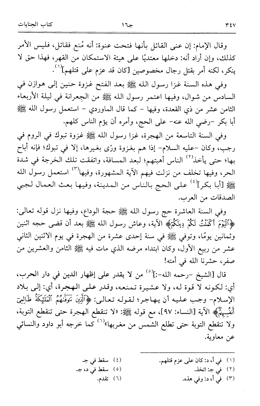 قال [الشيخ – رحمه الله -:] من لا يقدر على إظهار الدين في دار الحرب، أي: لكونه لا قوة له، ولا عشيرة تمنعه، وقدر على الهجرة، أي: إلى بلاد الإسلام- وجب عليه أن يهاجر؛ لقوله تعالى: {الَّذِينَ تَتَوَفَّاهُمْ الْمَلائِكَةُ ظَالِمِي أَنفُسِهِمْ} الآية [النساء: 97]، مع قوله صلى الله عليه وسلم: "لا تنقطع الهجرة حتى تنقطع التوبة، ولا تنقطع التوبة حتى تطلع الشمس من مغربها" كما خرجه أبو داود والنسائي عن معاوية.