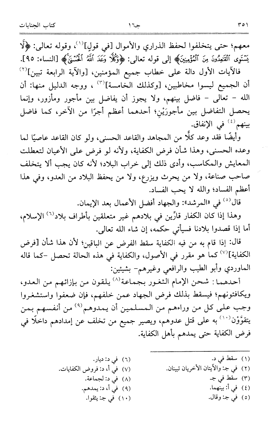 وأيضاً فقد وعد كلاًّ من المجاهد والقاعد الحسنى، ولو كان القاعد عاصياً لما وعده الحسنى، وهذا شأن فرض الكفاية، ولأنه لو فرض على الأعيان لتعطلت المعايش والمكاسب، وأدى ذلك إلى خراب البلاد؛ لأنه كان يجب ألا يتخلف صاحب صناعة، ولا من يحرث ويزرع، ولا من يحفظ البلاد من العدو، وفي هذا أعظم الفساد؛ والله لا يحب الفساد.