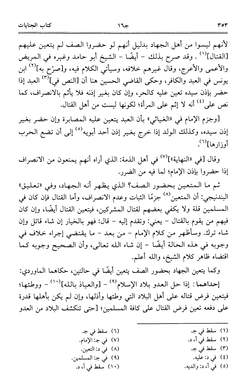 [وجزم الإمام في "الغياثي" بأن العبد يتعين عليه المصابرة وإن حضر بغير إذن سيده، وكذلك الولد إذا خرج بغير إذن أحد أبويه إلى أن تضع الحرب أوزارها].