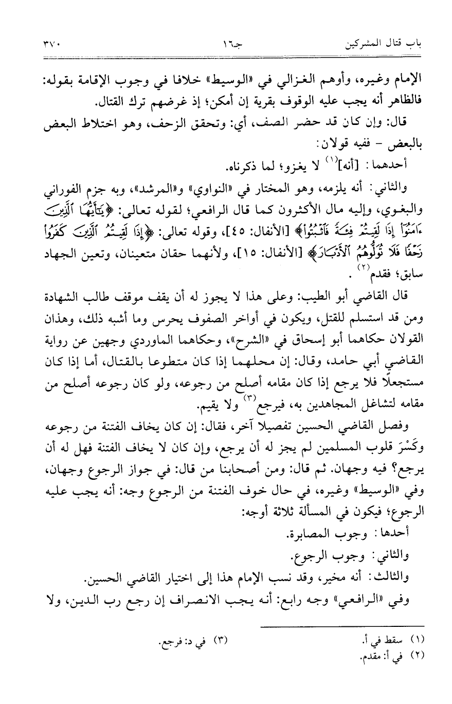 وفصل القاضي الحسين تفصيلاً آخر، فقال: إن كان يخاف الفتنة من رجوعه وكَسْرَ قلوب المسلمين لم يجز له أن يرجع، وإن كان لا يخاف الفتنة فهل له أن يرجع؟ فيه وجهان. ثم قال: ومن أصحابنا من قال: في جواز الرجوع وجهان، وفي "الوسيط" وغيره، في حال خوف الفتنة من الرجوع وجه: أنه يجب عليه الرجوع؛ فيكون في المسألة ثلاثة أوجه: