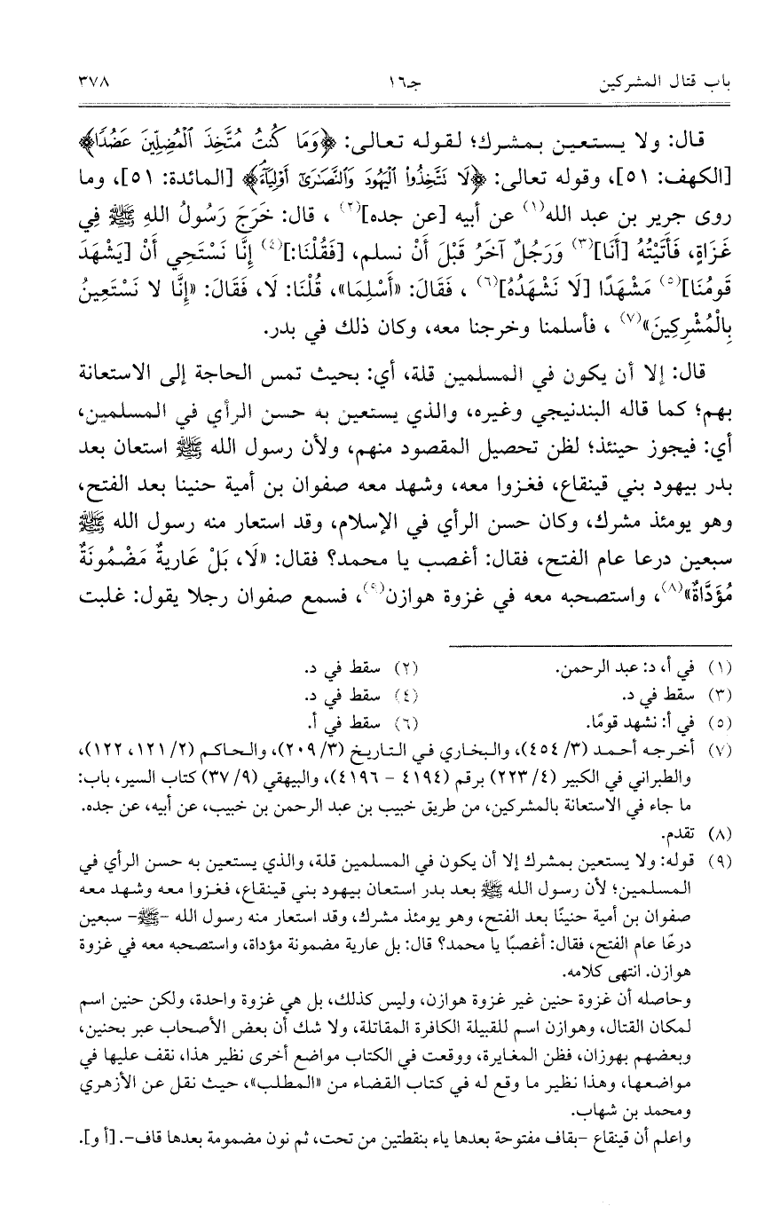 قال: ولا يستعين بمشرك؛ لقوله تعالى: {وَمَا كُنتُ مُتَّخِذَ الْمُضِلِّينَ عَضُداً} [الكهف: 51]، وقوله تعالى: {لا تَتَّخِذُوا الْيَهُودَ وَالنَّصَارَى أَوْلِيَاءَ} [المائدة: 51]، وما روى جرير بن عبد الله عن أبيه [عن جده]، قال: خَرَجَ رَسُولُ اللهِ صلى الله عليه وسلم فِي غَزَاةٍ، فَأَتَيْنُهُ [أَنَا] وَرَجُلٌ آخَرُ قَبْلَ أَنْ نسلم، [فَقُلْنَا:] إِنَّا نَسْتَحِي أَنْ [يَشْهَدَ قَومُنَا] مَشْهَداً [لاَ نَشْهَدُهُ]، فَقَالَ: "أَسْلِمَا"، قُلْنَا: لاَ، فَقَالَ: "إِنَّا لا نَسْتَعِينُ بِالْمشْرِكينَ"، فأسلمنا وخرجنا معه، وكنا ذلك في بدر.