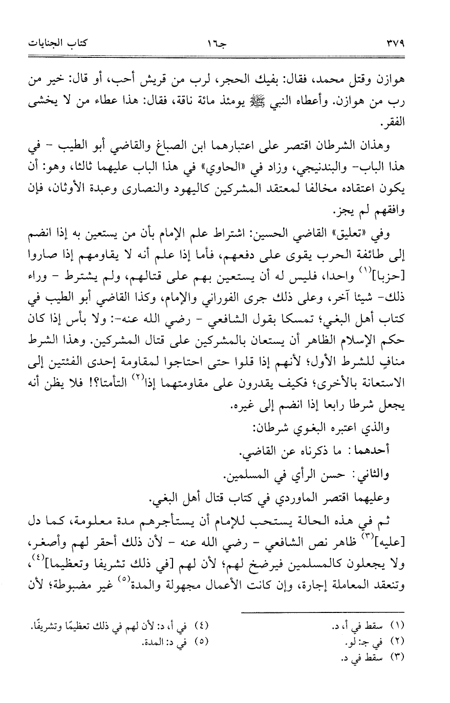 وفي "تعليق" القاضي الحسين: اشتراط علم الإمام بأن من يستعين به إذا انضم إلى طائفة الحرب يقوي على دفعهم، فأما إذا علم أنه لا يقاومهم إذا صاروا [حزبا] واحداً، فليس له أن يستعين بهم على قتالهم، ولم يشترط – وراء ذلك – شيئاً آخر، وعلى ذلك جرى الفوراني والإمام، وكذا القاضي أبو الطيب في كتاب أهل البغي؛ تمسكا بقول الشافعي – رضي الله عنه -: ولا بأس إذا كان حكم الإسلام الظاهر أن يستعان بالمشركين على قتال المشركين. وهذا الشرط منافٍ للشرط الأول؛ لأنهم إذا قلوا حتى احتاجوا لمقاومة إحدى الفئتين إلى الاستعانة بالأخرى؛ فكيف يقدرون على مقاوتمهما إذا التأمتا؟! فلا يظن أنه يجعل شرطا رابعا إذا انضم إلى غيره.