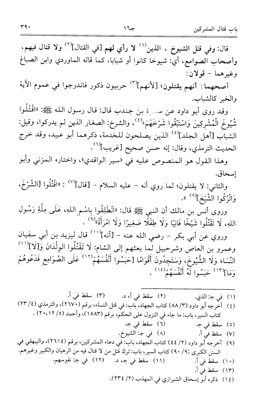 قال: وفي قتل الشيوخ، الذين لا رأي لهم [في القتال] ولا قتال فيهم، وأصحاب الصوامع، أي: شيوخاً كانوا أو شباباً، كما قاله الماوردي وابن الصباغ وغيرهما – قولان: