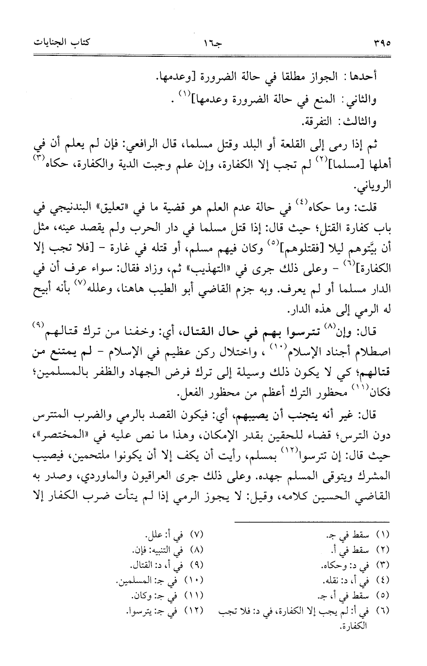 قلت: وما حكاه في حالة عدم العلم هو قضية ما في "تعليق" البندنيجي في باب كفارة القتل؛ حيث قال: إذا قتل مسلماً في دار الحرب ولم يقصد عينه، مثل أن بيَّتوهم ليلا [فقتلوهم] وكان فيهم مسلم، أو قتله في غارة -[فلا تجب إلا الكفارة]- وعلى ذلك جرى في "التهذيب" ثم، وزاد فقال: سواء عرف أن في الدار مسلماً أو لم يعرف. وبه جزم القاضي أبو الطيب هاهنا، وعلله بأنه أبيح له الرمي إلى هذه الدار.