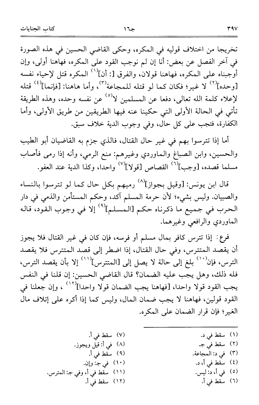 تخريجاً من اختلاف قوليه في المكره، وحكى القاضي الحسين في هذه الصورة في آخر الفصل عن بعض: أنا إن لم نوجب القود على المكره، فهاهنا أولى، وإن أوجبناه على المكره، فهاهنا قولان، والفرق [: أن] المكره قتل لإحياء نفسه [وحده] لا غير؛ فكان كما لو قتله للمجاعة، وأما هاهنا: [فإنما] قتله لإعلاء كلمة الله تعالى، دفعاً عن المسلمين لا عن نفسه وحده، وهذه الطريقة تأتي في الحالة الأولى التي حكينا عنه فيها الطريقين من طريق الأولى، وأما الكفارة، فتجب على كل حال، وفي وجوب الدية خلاف سبق.