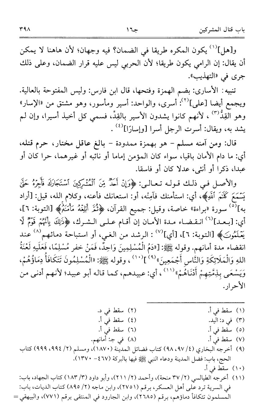 والأصل في ذلك قوله تعالى: {وَإِنْ أَحَدٌ مِنْ الْمُشْرِكِينَ اسْتَجَارَكَ فَأَجِرْهُ حَتَّى يَسْمَعَ كَلامَ اللَّهِ}، أي: استأمنك فآمِنْه، أو: استعانك فأعنه، وكلام الله، قيل: [أراد به] سورة "براءة" خاصة، وقيل: جميع القرآن، {ثُمَّ أَبْلِغْهُ مَامَنَهُ} [التوبة: 6]، أي: [بعد] انقضاء مدة الأمان إن أقام على الشرك، {ذَلِكَ بِأَنَّهُمْ قَوْمٌ لا يَعْلَمُونَ} [التوبة: 6]، [أي]: الرشد من الغي، أو استباحة دمائهم عند انقضاء مدة أمانهم. وقوله صلى الله عليه وسلم: ["دَمُ الْمُسْلِمِينَ وَاحِدٌ، فَمَنْ خفر مُسْلِماً، فَعَلَيهِ لَعْنَةُ اللهِ وَالْمَلاَئِكَةِ وَالنَّاسِ أَجْمَعِينَ"]، وقوله صلى الله عليه وسلم: "الْمُسْلِمُونَ تَتَكَافَأُ دِمَاؤُهُمْ، وَيَسْعَى بِذِمَّتِهِمْ أَدْنَاهُمْ"، أي: عبيدهم، كما قاله أبو عبيد؛ لأنهم أدنى من الأحرار.