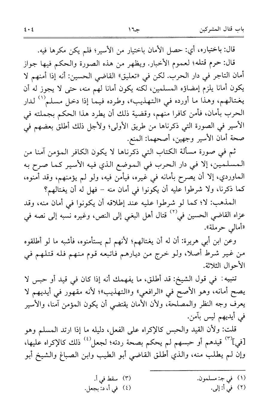 ثم في صورة مسألة الكتاب التي ذكرناها لا يكون الكافر المؤمن آمناً من المسلمين، إلا في دار الحرب في الموضع الذي فيه الأسير كما صرح به الماوردي، إلا أن يصرح بأمانه في غيره، فيأمن فيه، ولو لم يؤمنهم، وقد أمنوه، كما ذكرنا، ولا شرطوا عليه أن يكونوا في أمان منه – فهل له أن يغتالهم؟