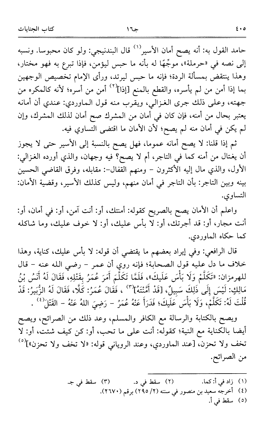 قال الرافعي: وفي إيراد بعضهم ما يقتضي أن قوله: لا بأس عليك، كناية، وهذا خلاف ما دل عليه قول الصحابة؛ فإنه روى أن عمر –رضي الله عنه – قال للهرمزان: "تَكَلَّمْ وَلاَ بَاسَ عَلَيكَ"، فَلَمَّا تَكَلَّمَ أَمَرَ عُمَرُ بِقَتْلِهِ، فَقَالَ لَهُ أَنَسُ بْنُ مَالِكٍ: لَيْسَ إِلَى ذَلِكَ سَبِيلٌ، [قَدْ أَمَّنْتَهُ]، فَقَالَ عُمَرُ: كَلاَّ، فَقَالَ لَهُ الزُّبَيرُ: قَدْ قُلْتَ لَهُ: تَكَلَّمْ، وَلاَ بَاسَ عَلَيكَ؛ فَدَرَأَ عَنْهُ عُمَرُ – رَضِيَ اللهُ عَنْهُ – القَتْلَ.