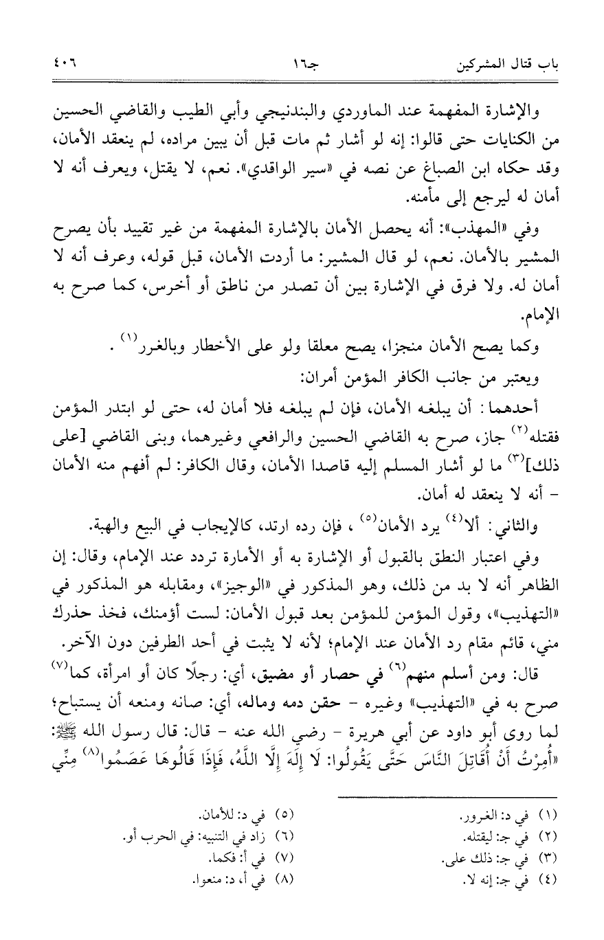 والإشارة المفهمة عند الماوردي والبندنيجي وأبي الطيب والقاضي الحسين من الكنايات حتى قالوا: إنه لو أشار ثم مات قبل أن يبين مراده، لم ينعقد الأمان، وقد حكاه ابن الصباغ عن نصه في "سير الواقدي". نعم، لا يقتل، ويعرف أنه لا أمان له ليرجع إلى مأمنه.