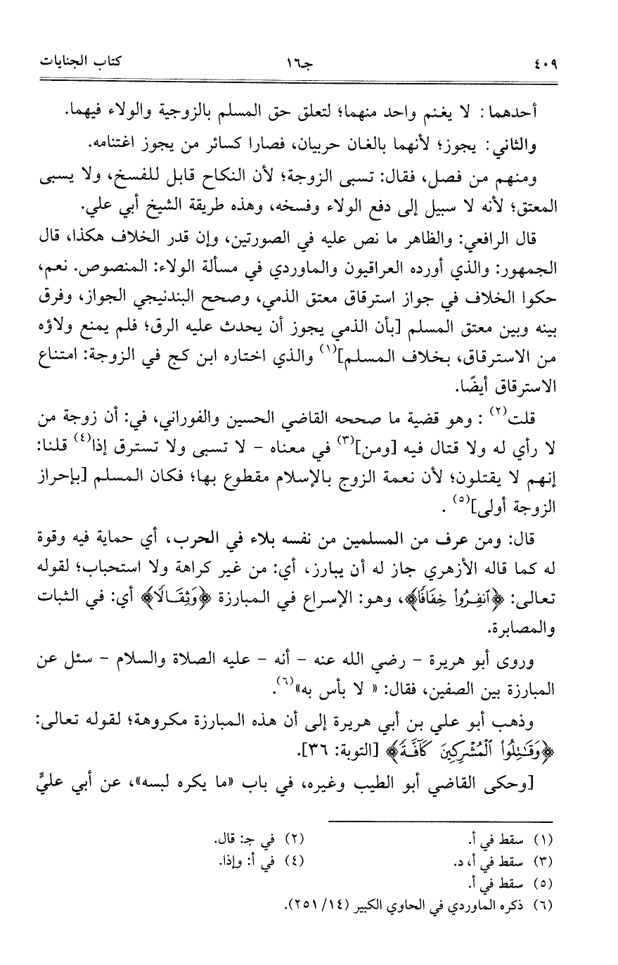 وذهب أبو علي بن أبي هريرة إلى أن هذه المبارزة مكروهة؛ لقوله تعالى: {وَقَاتِلُوا الْمُشْرِكِينَ كَافَّةً} [التوبة: 36].
