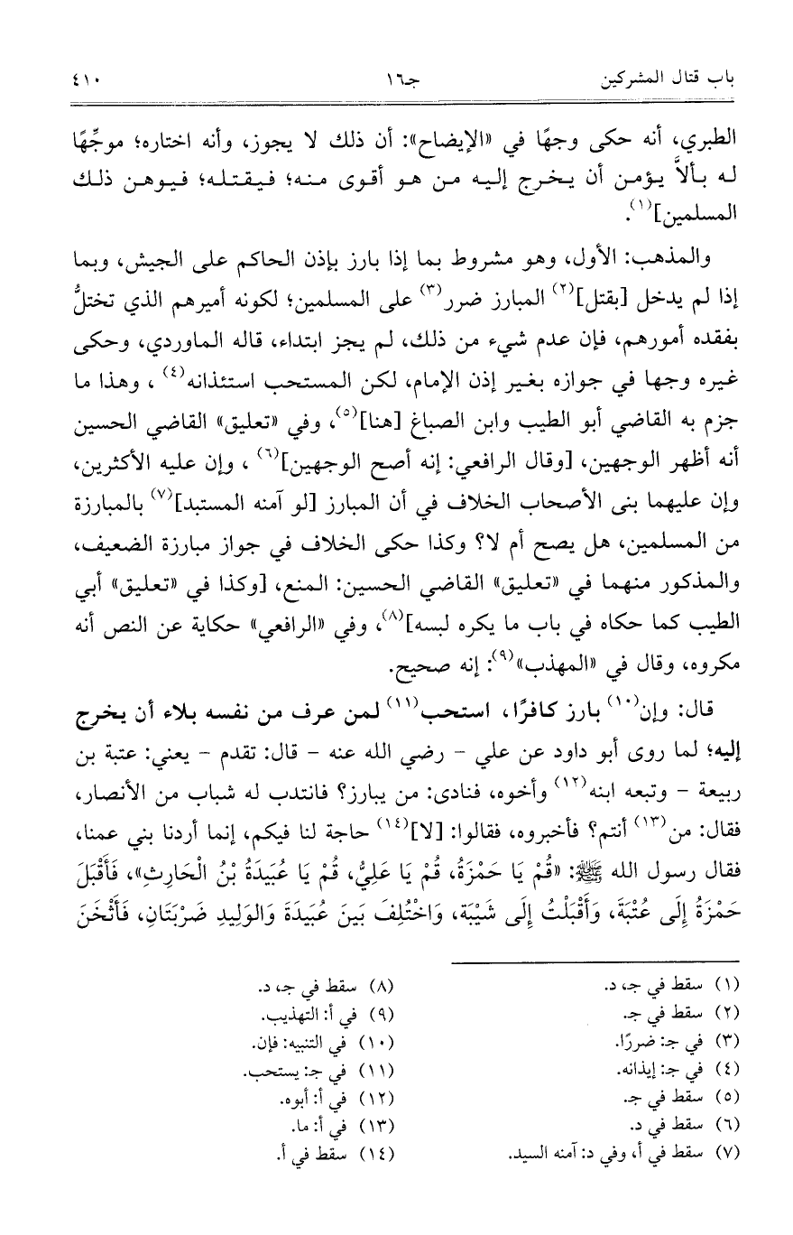 قال: وإن بارز كافراً، استحب لمن عرف من نفسه بلاء أن يخرج إليه؛ لما روى أبو داود عن علي –رضي الله عنه – قال: تقدم – يعني: عتبة بن ربيعة – وتبعه ابنه وأخونه، فنادى: من يبارز؟ فانتدب له شباب من الأنصار، فقال: من أنتم؟ فأخبروه، فقالوا: [لا] حاجة لنا فيكم، إنما أردنا بنى عمنا، فقال رسول الله صلى الله عليه وسلم: "قُمْ يَا حَمْزَةُ، قُمْ يَا عَلِيُّ، قُمْ يَا عُبَيدَةُ بْنُ الْحَارِثِ"، فَأَقْبَلَ حَمْزَةُ إِلَى عُتْبَةَ، وَاَقْبَلْتُ إِلَى شَيْبَة، وَاخْتُلِفَ بَينَ عُبَيدَةَ وَالوَلِيدِ ضَربَتَانِ، فَأَثْخَنَ