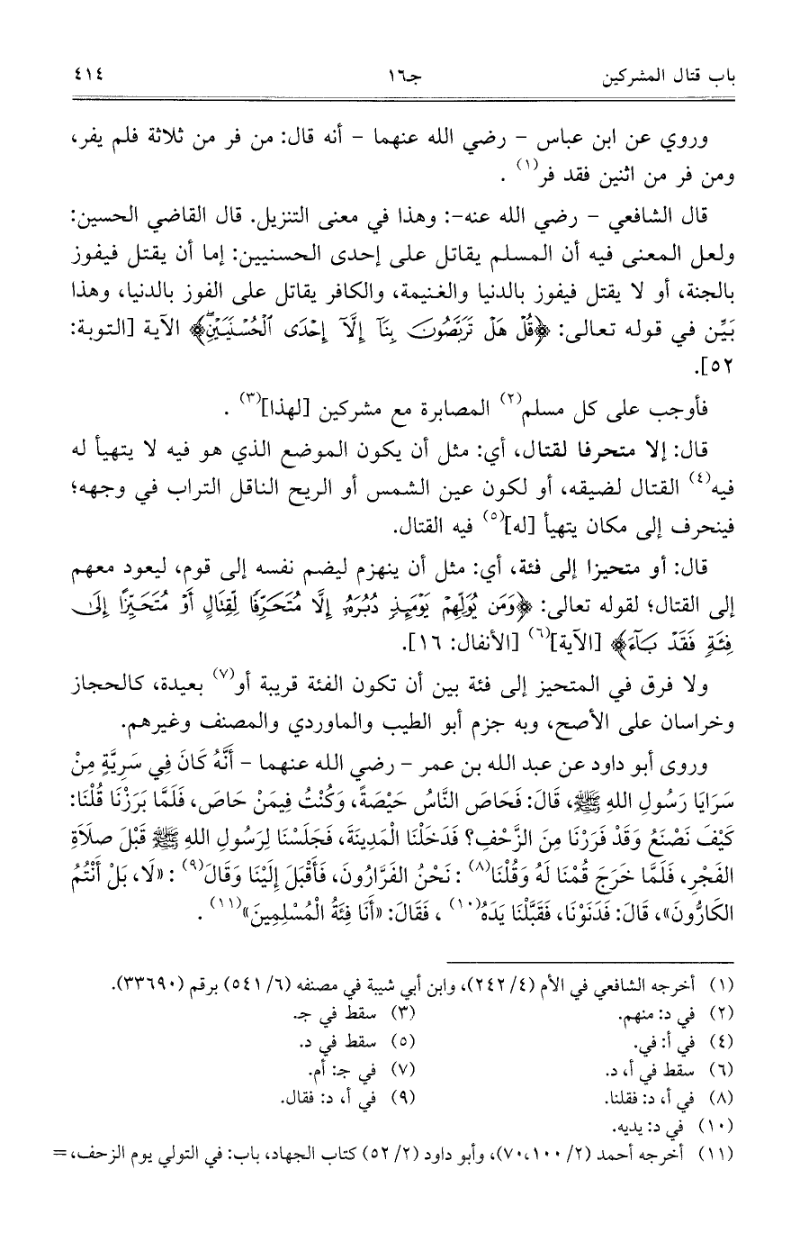 وروي عن ابن عباس – رضي الله عنهما – أنه قال: من فر من ثلاثة فلم يفر، ومن فر من اثنين فقد فر.