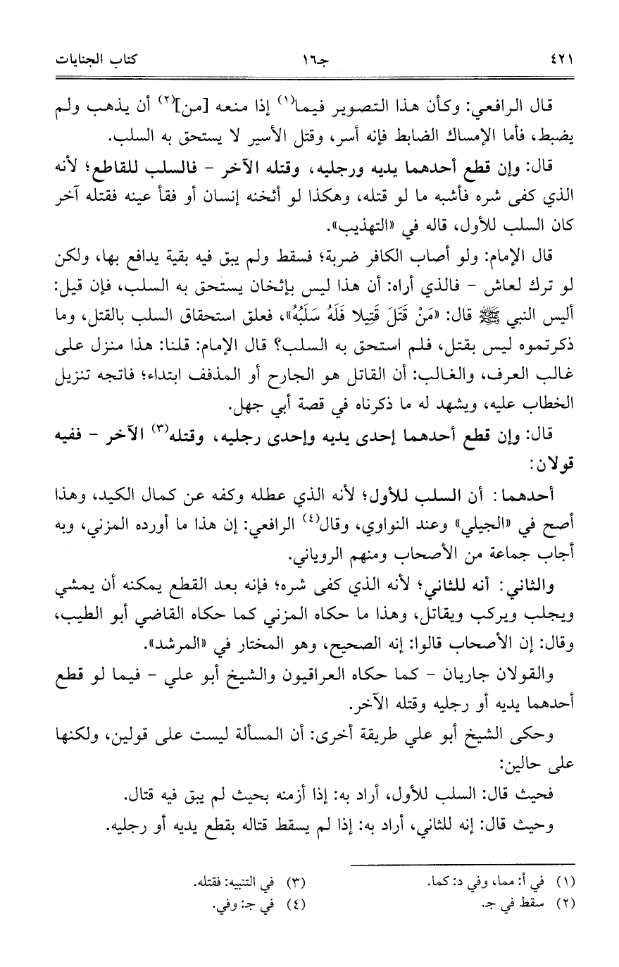قال الإمام: ولو أصاب الكافر ضربة؛ فسقط ولم يبق فيه بقية يدافع بها، ولكن لو ترك لعاش – فالذي أراه: أن هذا ليس بإثخان يستحق به السلب، فإن قيل: أليس النبي صلى الله عليه وسلم قال:"مَنْ قَتَلَ قَتِيلاً فَلَهُ سَلُبهُ"، فعلق استحقاق السلب بالقتل، وما ذكرتموه ليس بقتل، فلم استحق به السلب؟ قال الإمام: قلنا: هذا منزل على غالب العرف، والغالب: أن القاتل هو الجارح أو المذفف ابتداء؛ فاتجه تنزيل الخطاب عليه، ويشهد له ما ذكرناه في قصة أبي جهل.