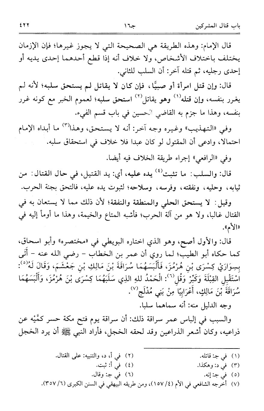 قال الإمام: وهذه الطريقة هي الصحيحة التي لا يجوز غيرها؛ فإن الأزمان يختلف باختلاف الأشخاص، ولا خلاف أنه إذا قطع أحدهما إحدى يديه أو إحدى رجليهن ثم قتله آخر: أن السلب للثاني.
