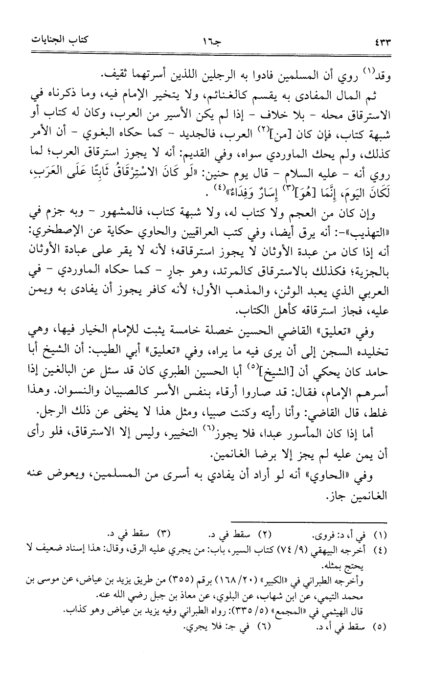 ثم المال المفادي به يقسم كالغنائم، ولا يتخير الإمام فيه، وما ذكرناه في الاسترقاق محله – بلا خلاف – إذا لم يكن الأسير من العرب، وكان له كتاب أو شبهة كتاب، فإن كان [من] العرب، فالجديد – كما حكاه البغوي – أن الأمر كذلك، ولم يحك الماوردي سواه، وفي القديم: أنه لا يجوز استرقاق العرب؛ لما روي أنه – عليه السلام – قال يوم حنين: "لَو كَانَ الاسْتِرْقَاقُ ثَابِتاً عَلَى العَرَبِ، لَكَانَ اليَومَ، إِنَّمَا [هُوَ] إِسَارٌ وَفِدَاءٌ".
