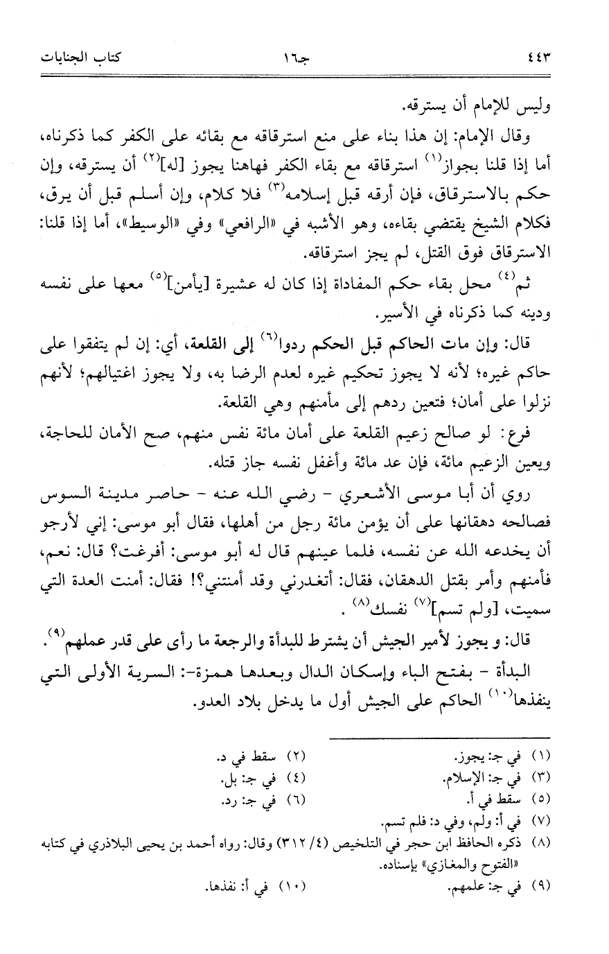 روي أن أبا موسى الأشعري – رضي الله عنه – حاصر مدينة السوس فصالحه دهقانها على أن يؤمن مائة رجل من أهلها، فقال أبو موسى: إني لأرجو أن يخدعه الله عن نفسه، فلما عينهم قال له أبو موسى: أفرغت؟ قال: نعم، فأمنهم وأمر بقتل الدهقان، فقال: أتغدرني وقد أمنتني؟! فقال: أمنت العدة التي سميت، [ولم تسم] نفسك.